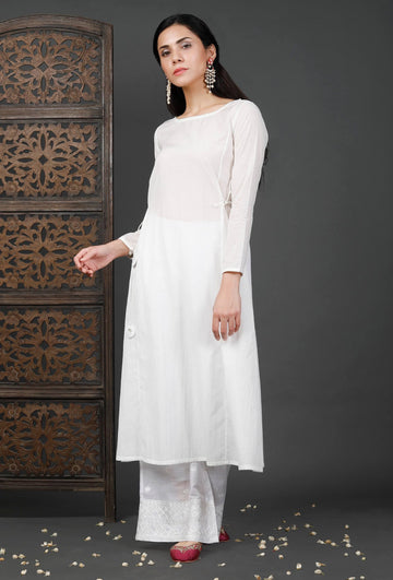 A white kurta handcrafted in soya cotton by the skilled artisans of India. This beautiful long-sleeved kurta features dori tie-ups at the sides with mirror work for a lovely touch. Dimension : L:46 Inch, Lenght of Sleeves: 22 Inch Color:...