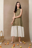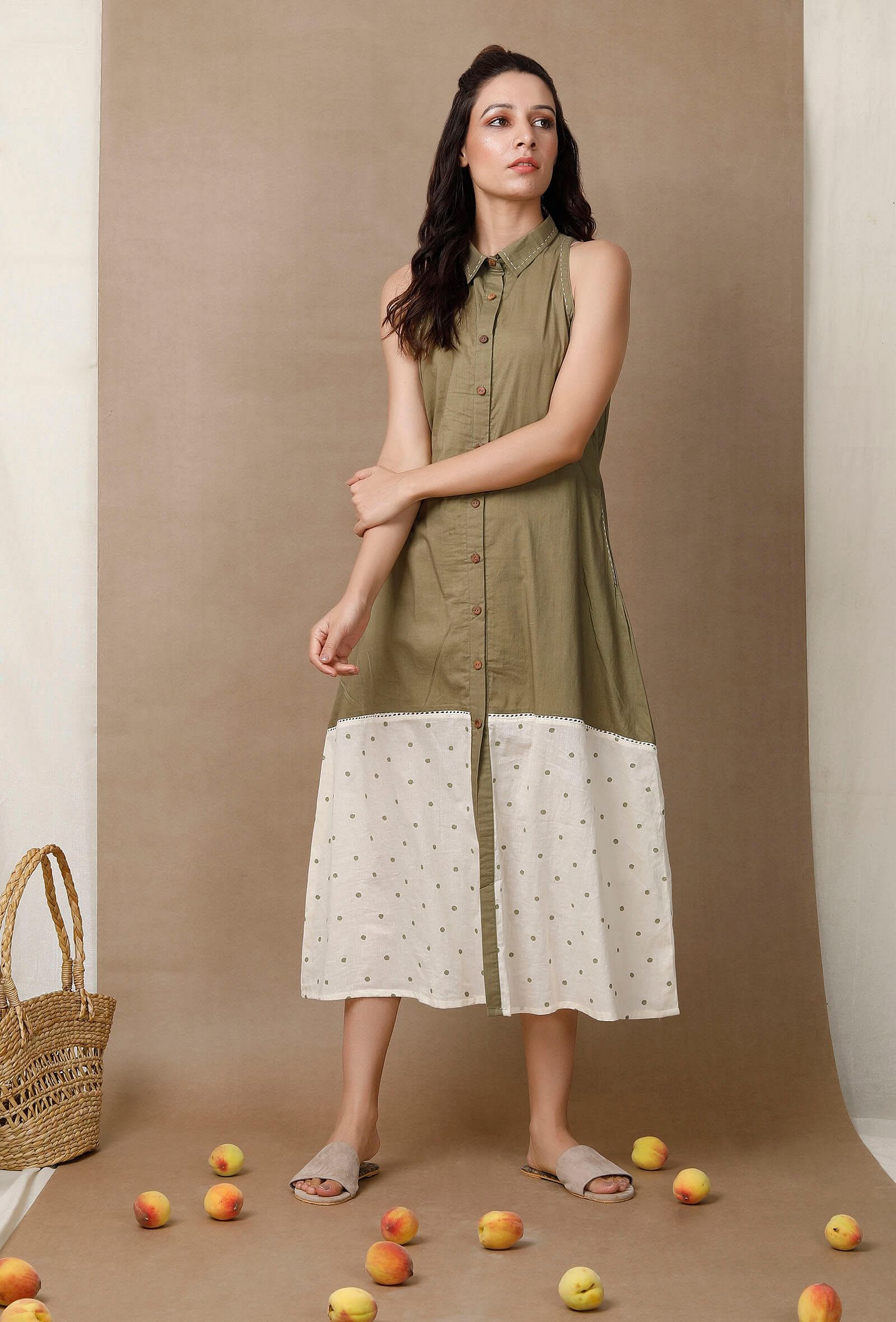 Easy, breezy and perfect for your summer dates and lunches, this green cotton dress features a collared neckline. With a front open design and coconut shell buttons, it has been finished with a hand block printed polka dotted fabric at the bottom.
