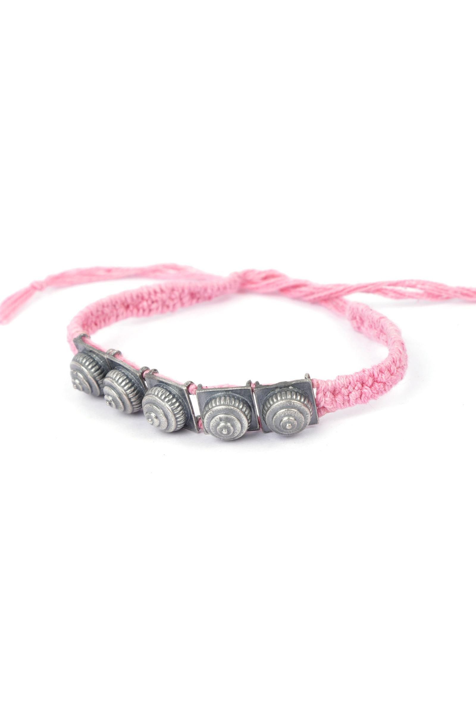 Set Of 2: Opal Pink Thread & Antique Plated Brass Beaded Anklets