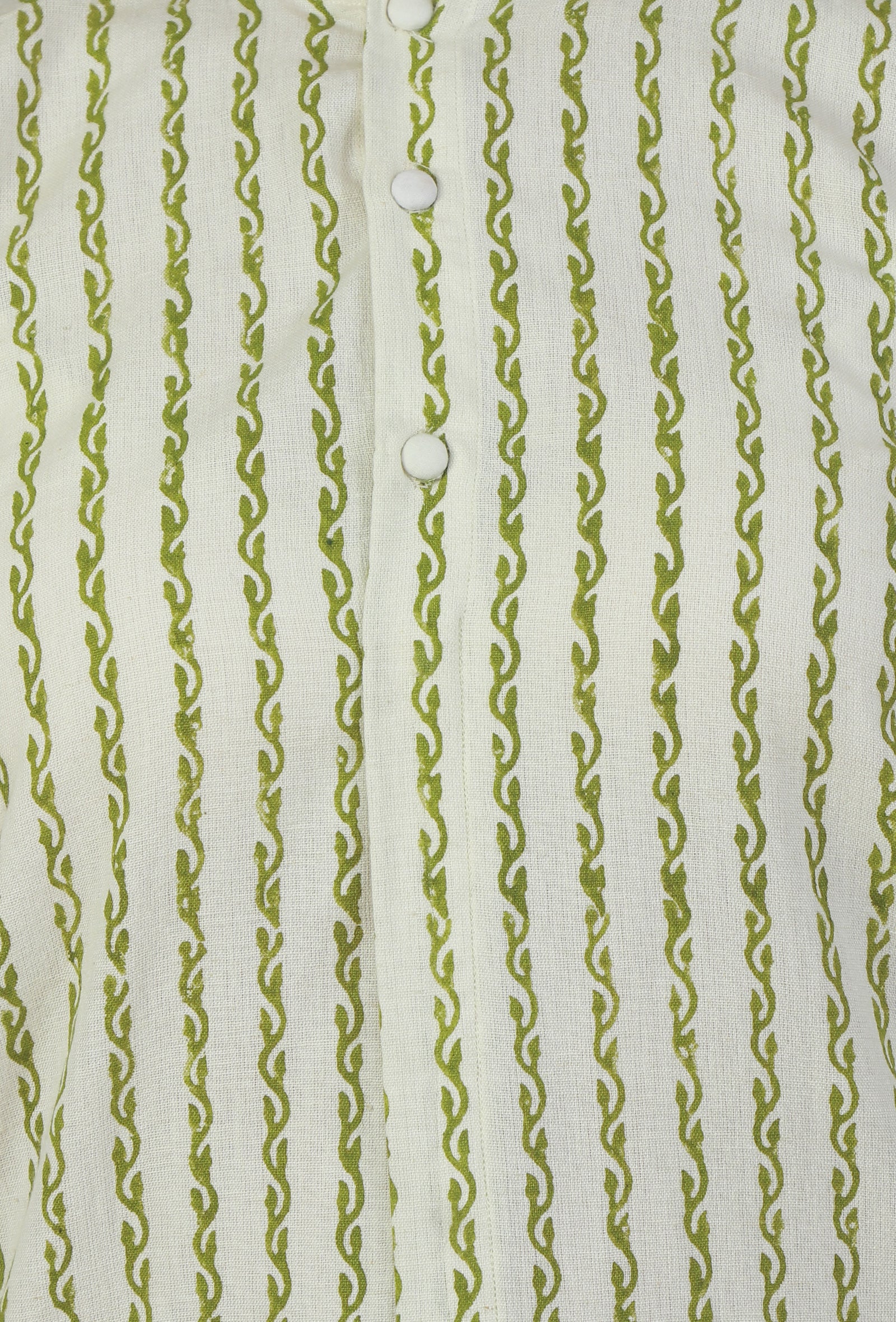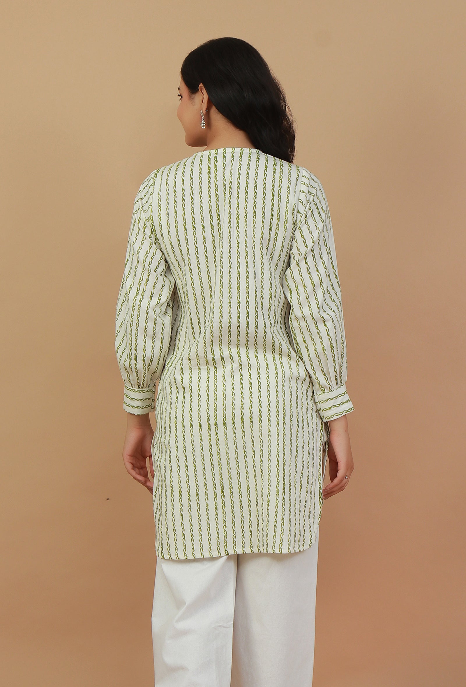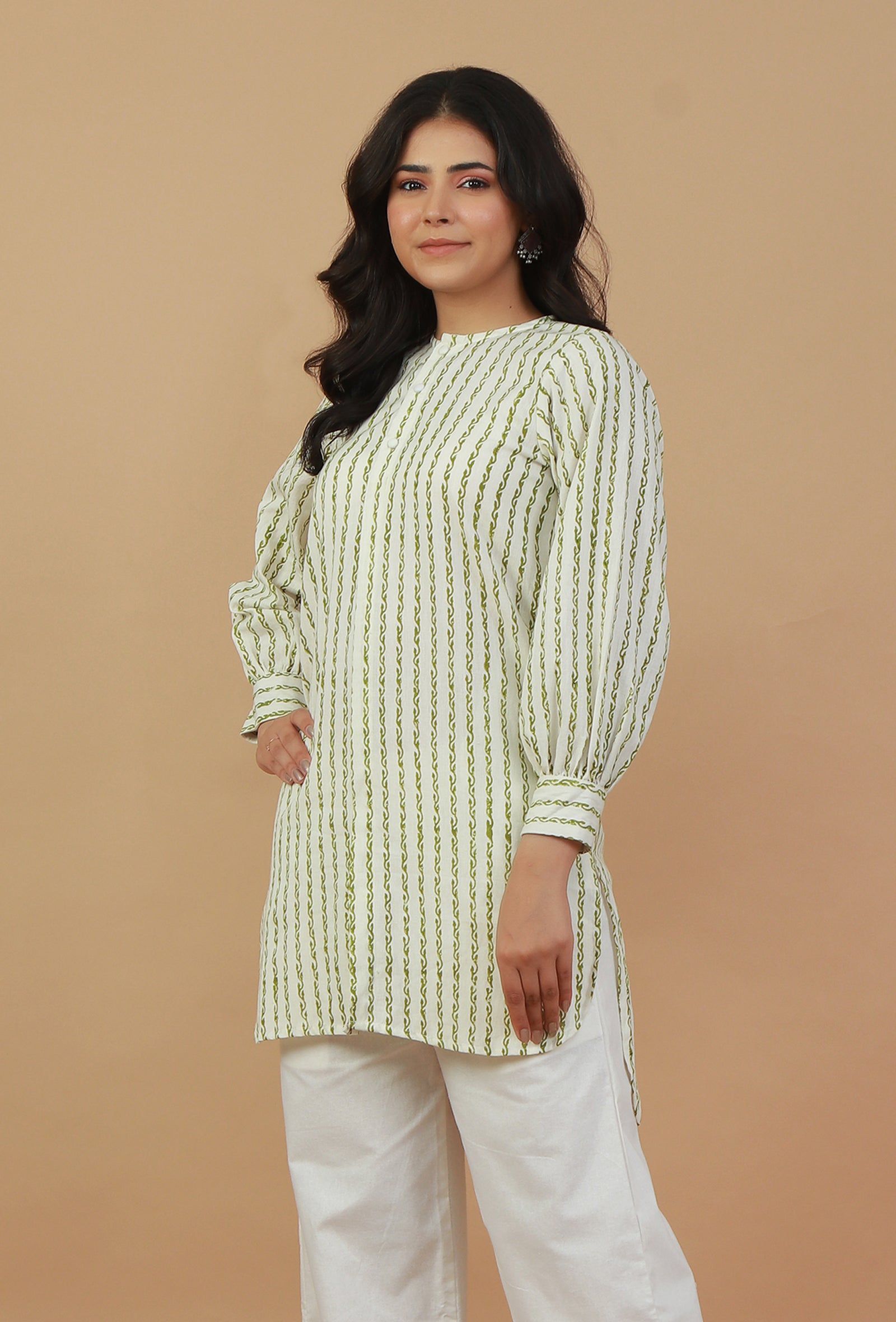 An elegant cotton kurta featuring subtle green hand block printed stripes on a white base. Designed with a round neckline, button placket, and balloon sleeves with cuffs, it blends minimal charm with everyday comfort, making it a versatile choice for office, casual, or semi-formal outings.