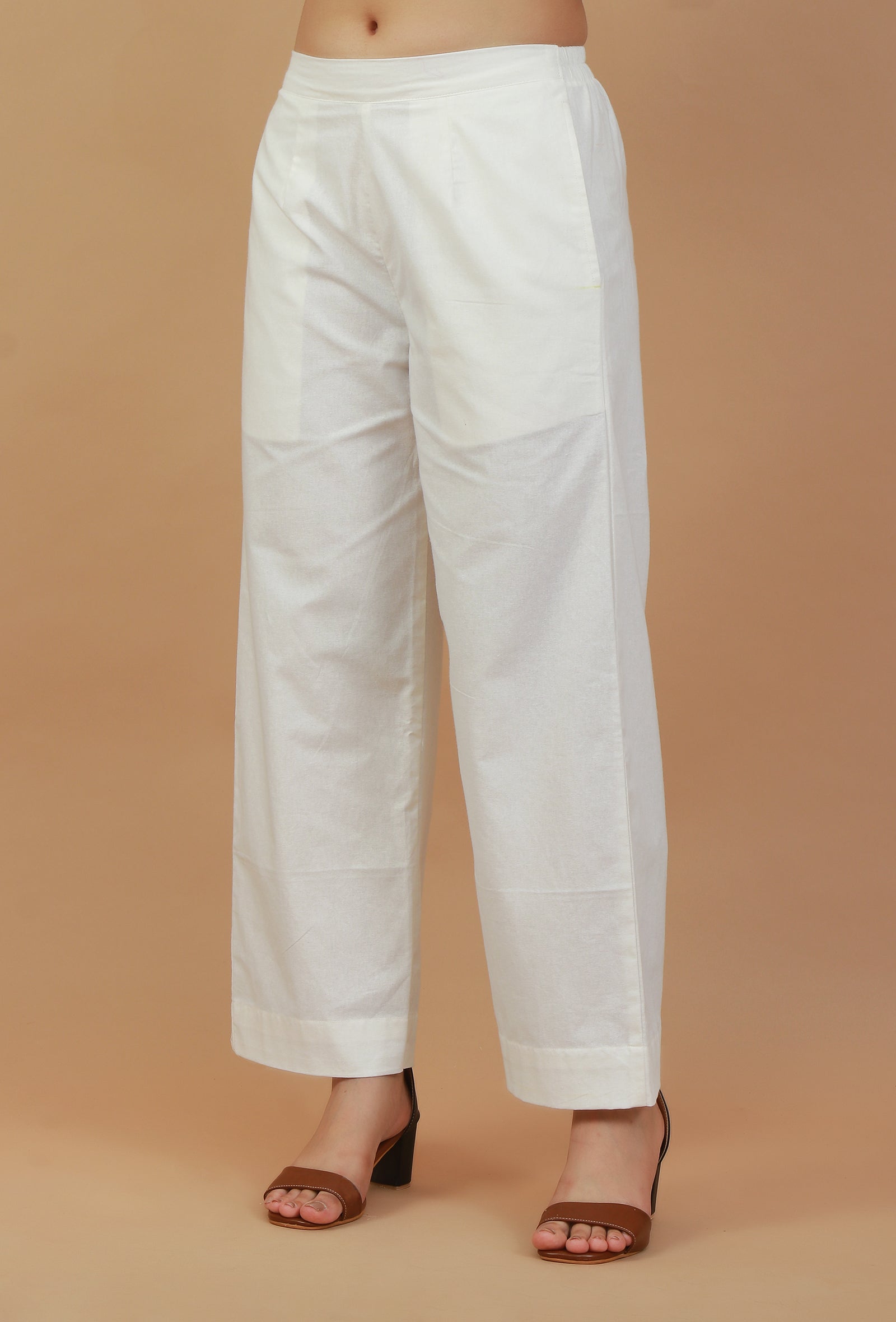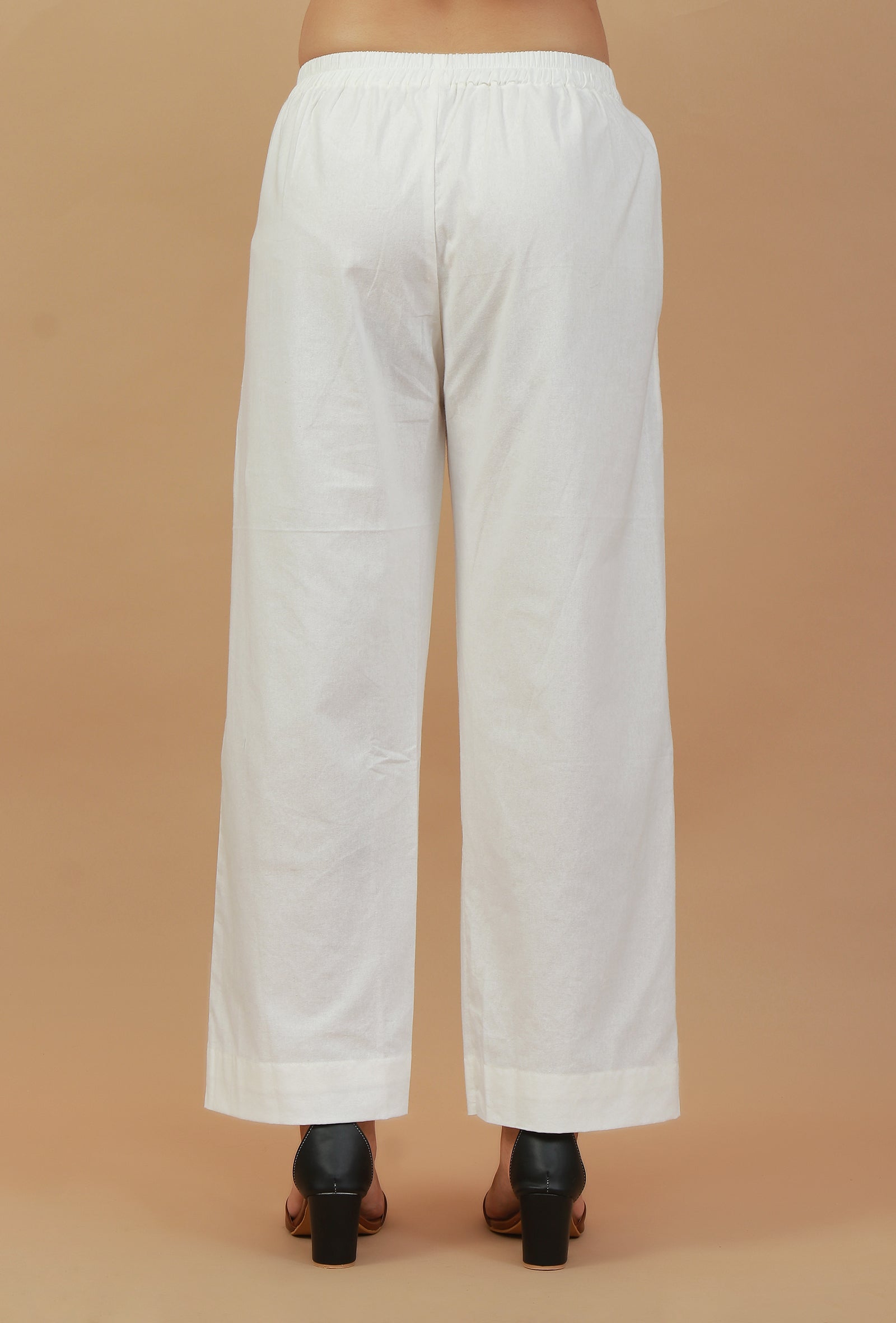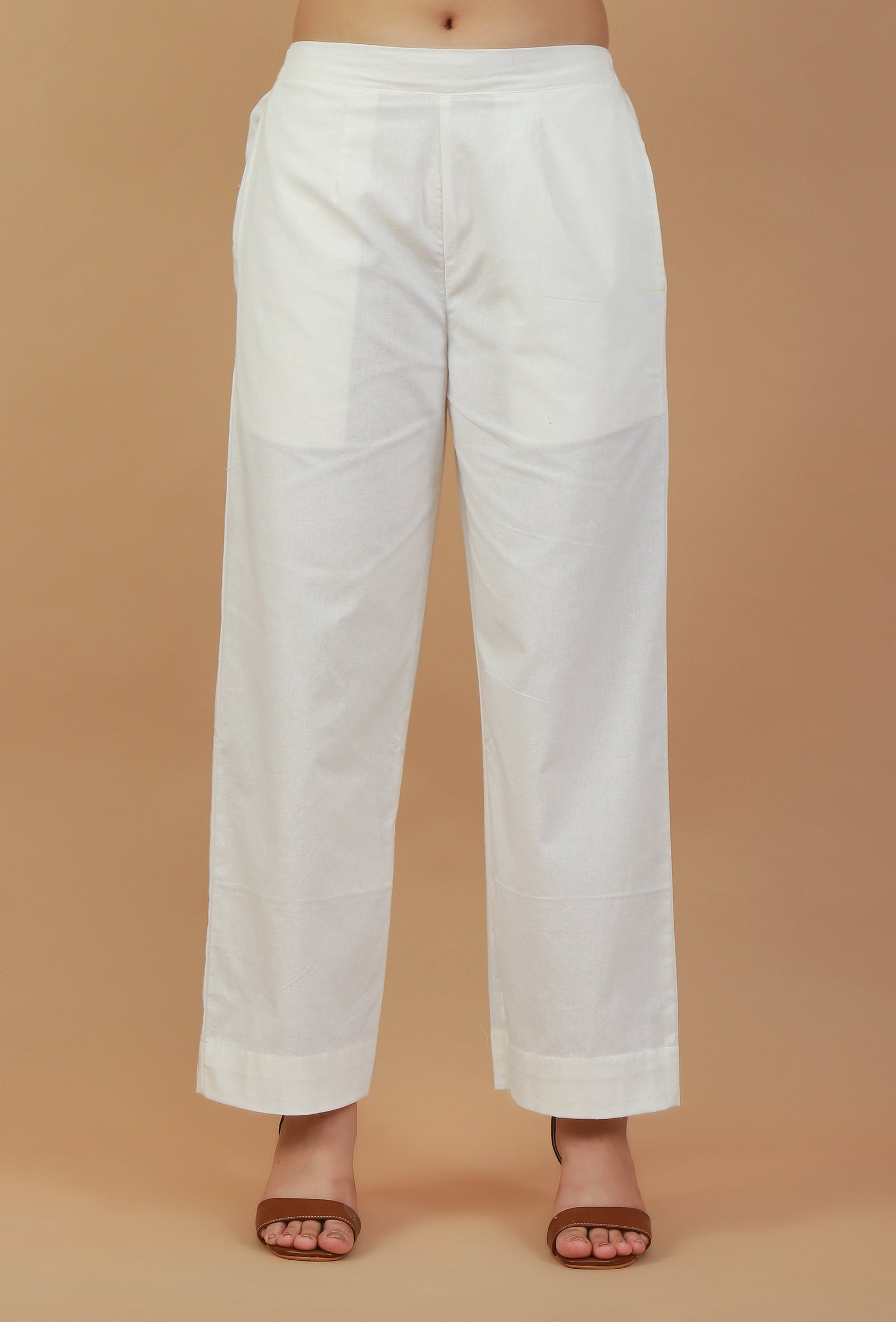 These solid white straight cotton pants are a wardrobe essential, offering effortless comfort and versatility. Made from breathable cotton, they feature a relaxed fit and clean design, making them perfect to pair with kurtas, tunics, or tops for any occasion.