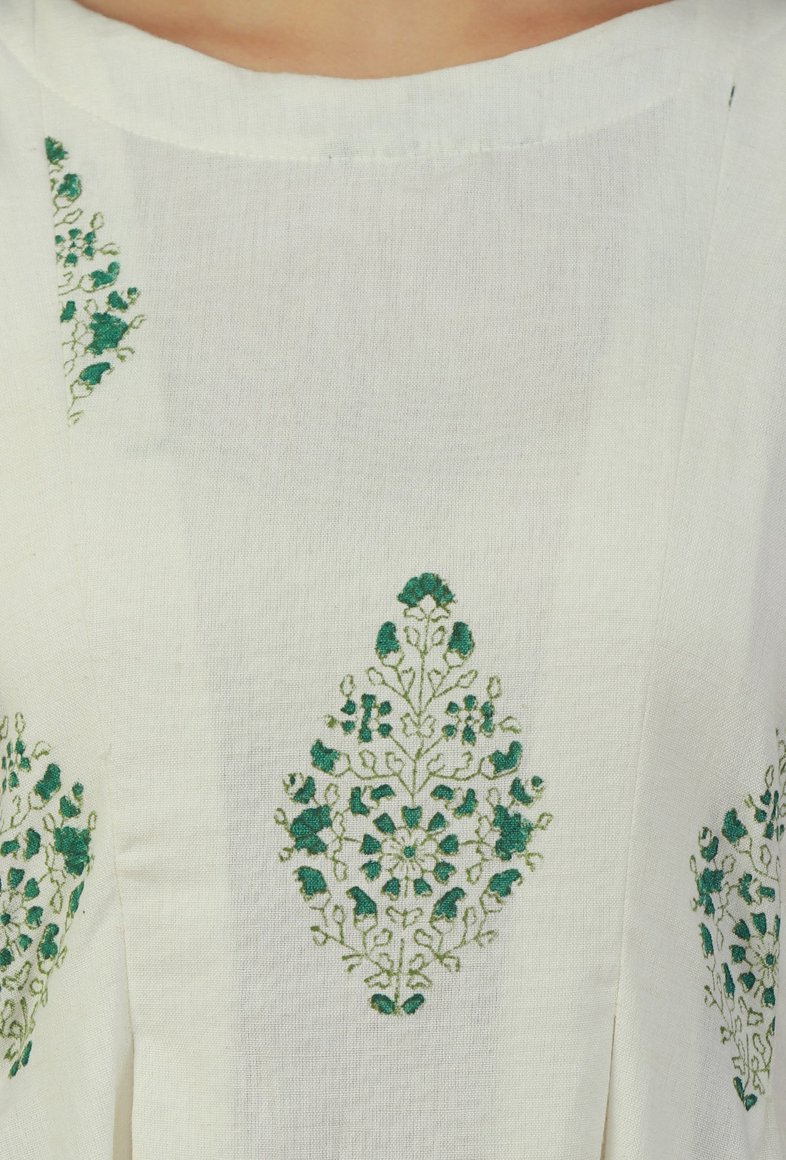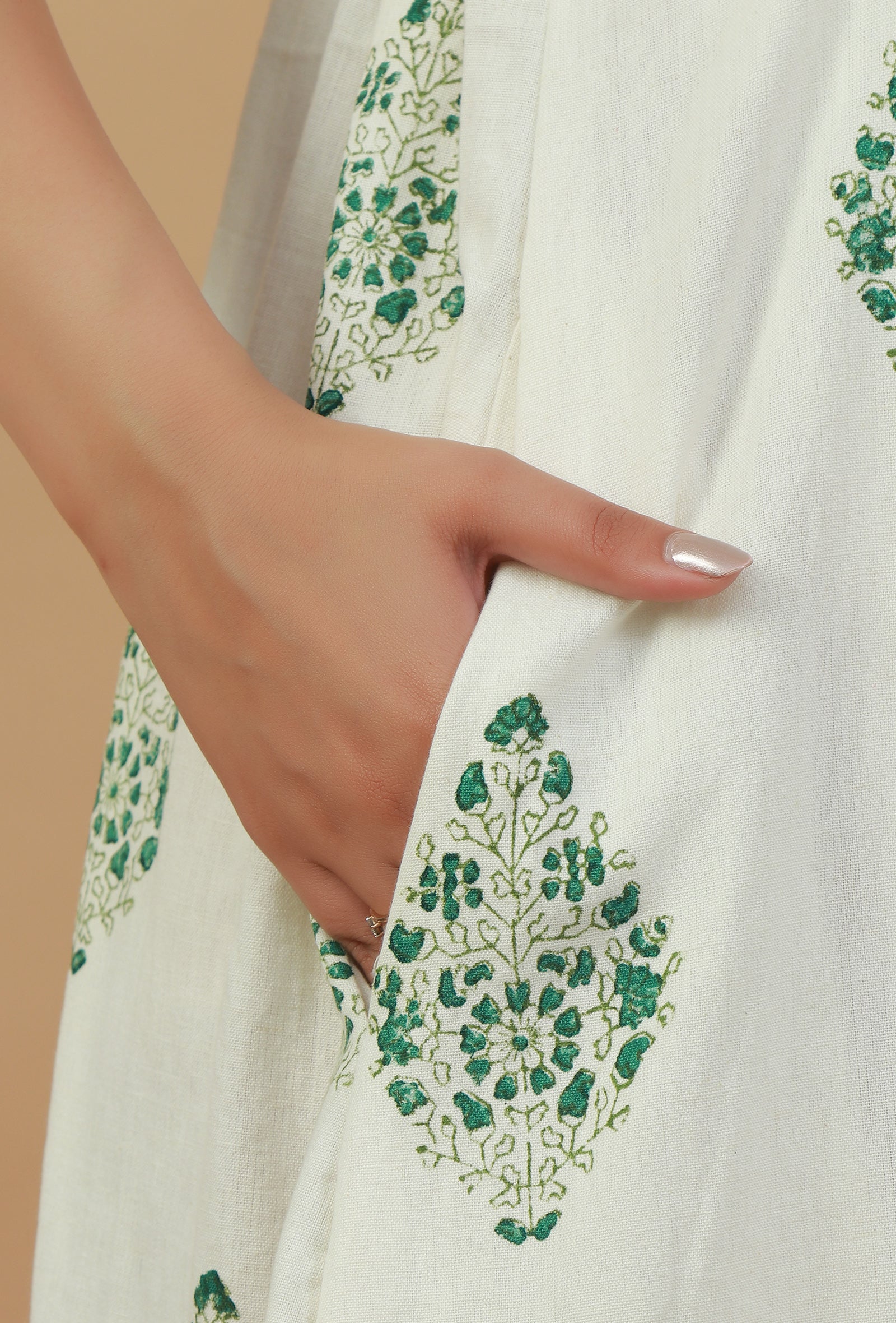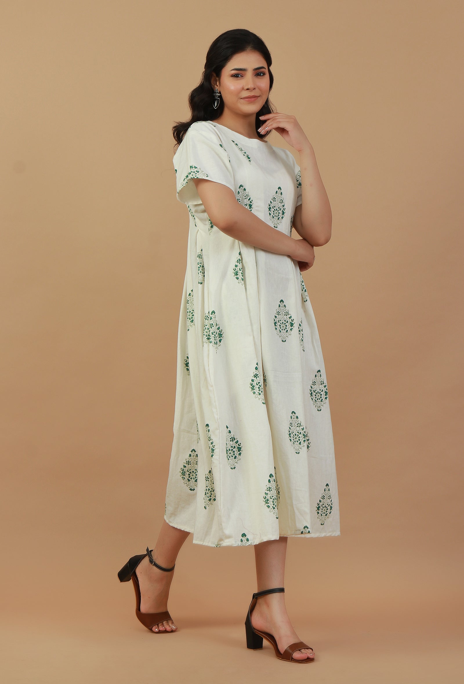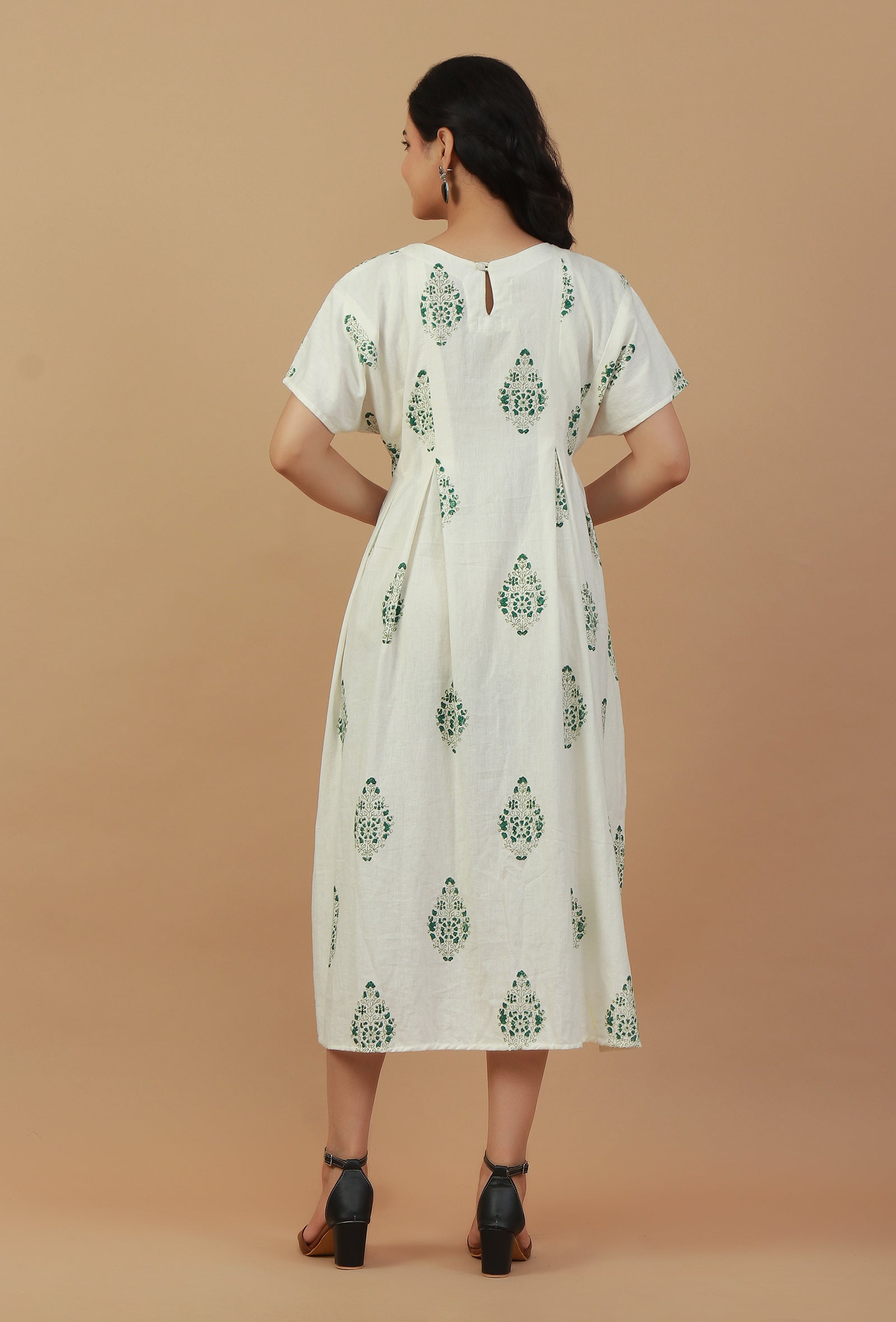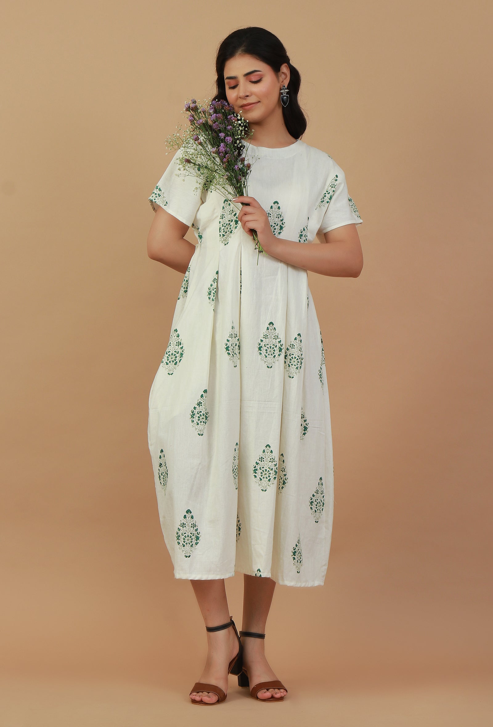 Step out in style with the Meadow Muse Pleated Midi Dress. This charming dress features a classic silhouette with a twist, combining a clean, off-white background with a striking green botanical print. The pleated front adds beautiful texture and movement, while the short sleeves and round neckline ensure a comfortable and relaxed fit. It's the perfect piece for a casual day out or a semi-formal gathering.