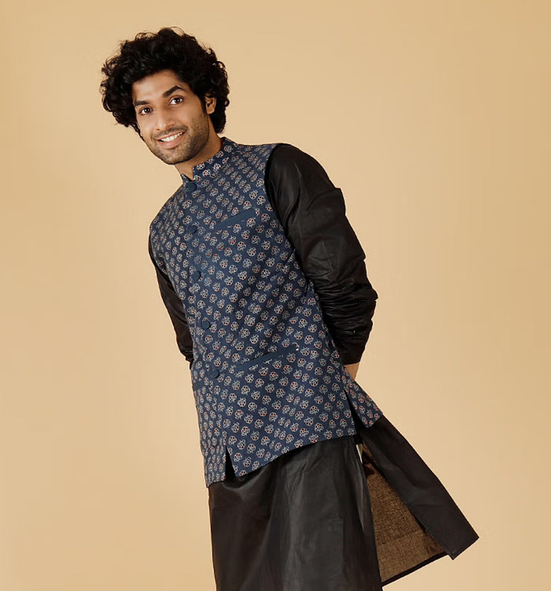 Steal the limelight in Tjori's olive green Ajrakh print Nehru jacket. Style it casually with a shirt or a kurta pyjama, you will surely garner several eyeballs. Elegantly designed and crafted in cotton, this Nehru Jacket features Chinese collar and...