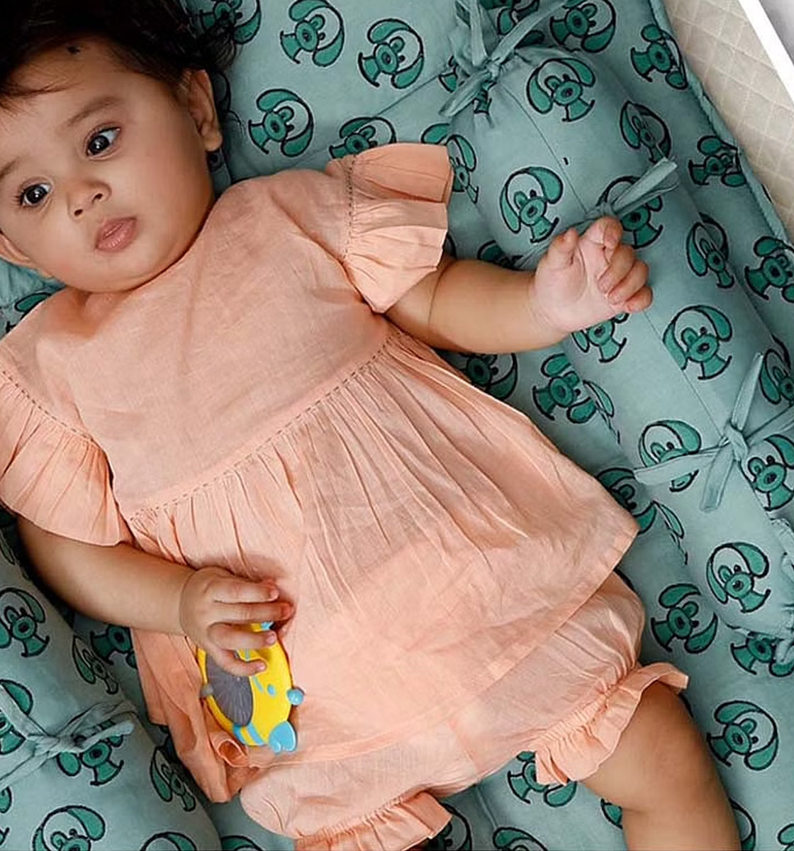 This handstitched peachy pink kurta pajama set is a heart stealer with its detailed best pocket and coconut shell buttons. It is made from sustainability promoting bamboo fabric and gives your baby no worries with its pure, irritation-free and breathable...