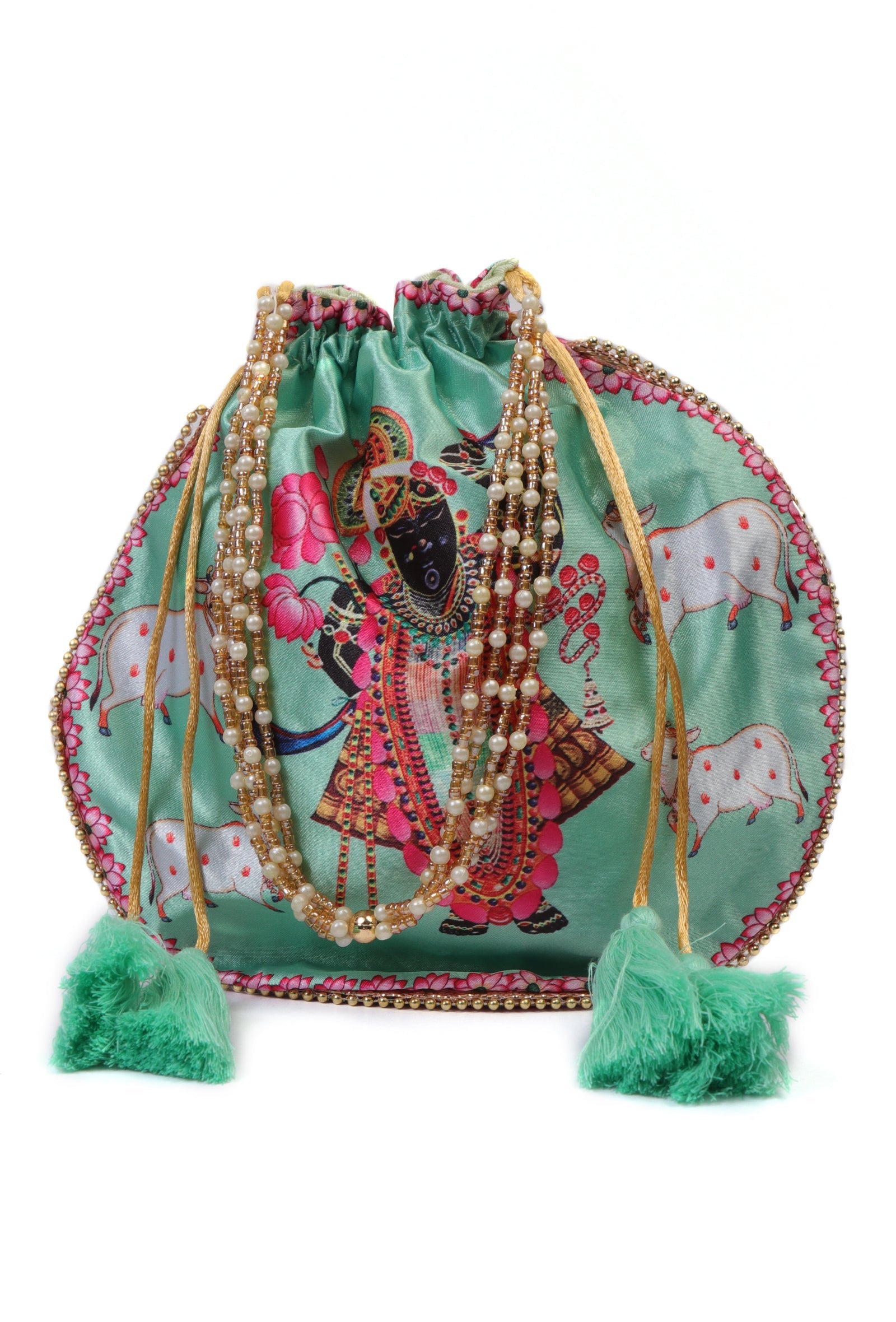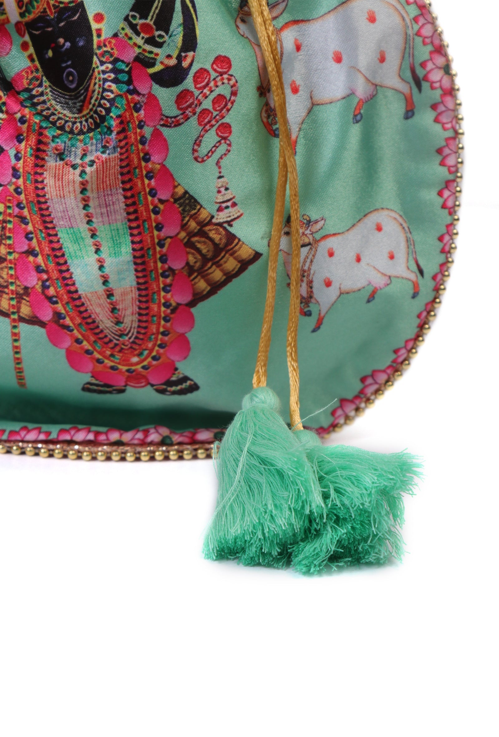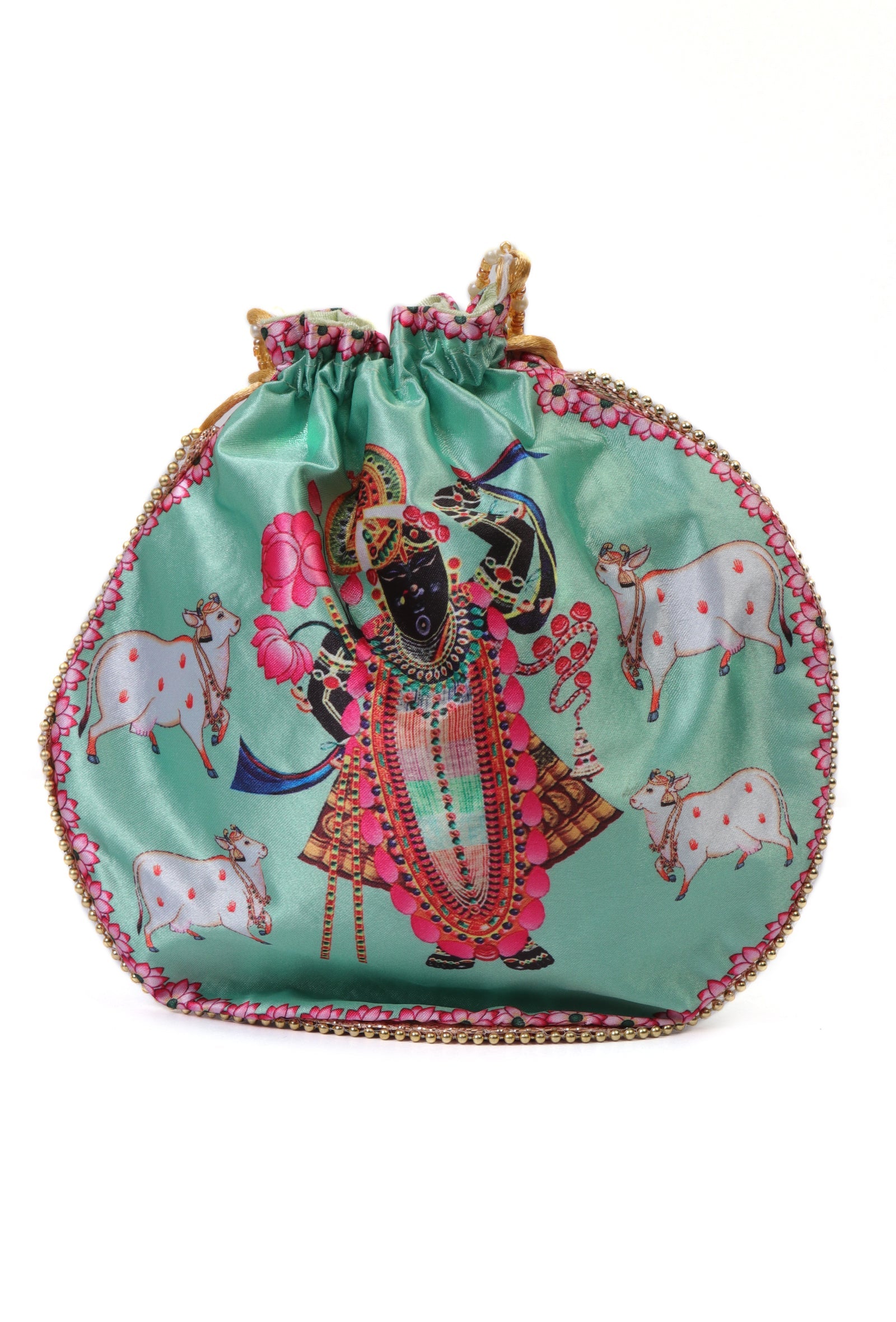 Celestial Green Shreenath with the Holy Cow Potli features a serene green base adorned with the revered Shreenath Ji print and sacred cow motifs. This divine potli embodies spiritual grace and tranquility, making it an elegant accessory for any spiritually uplifting occasion.