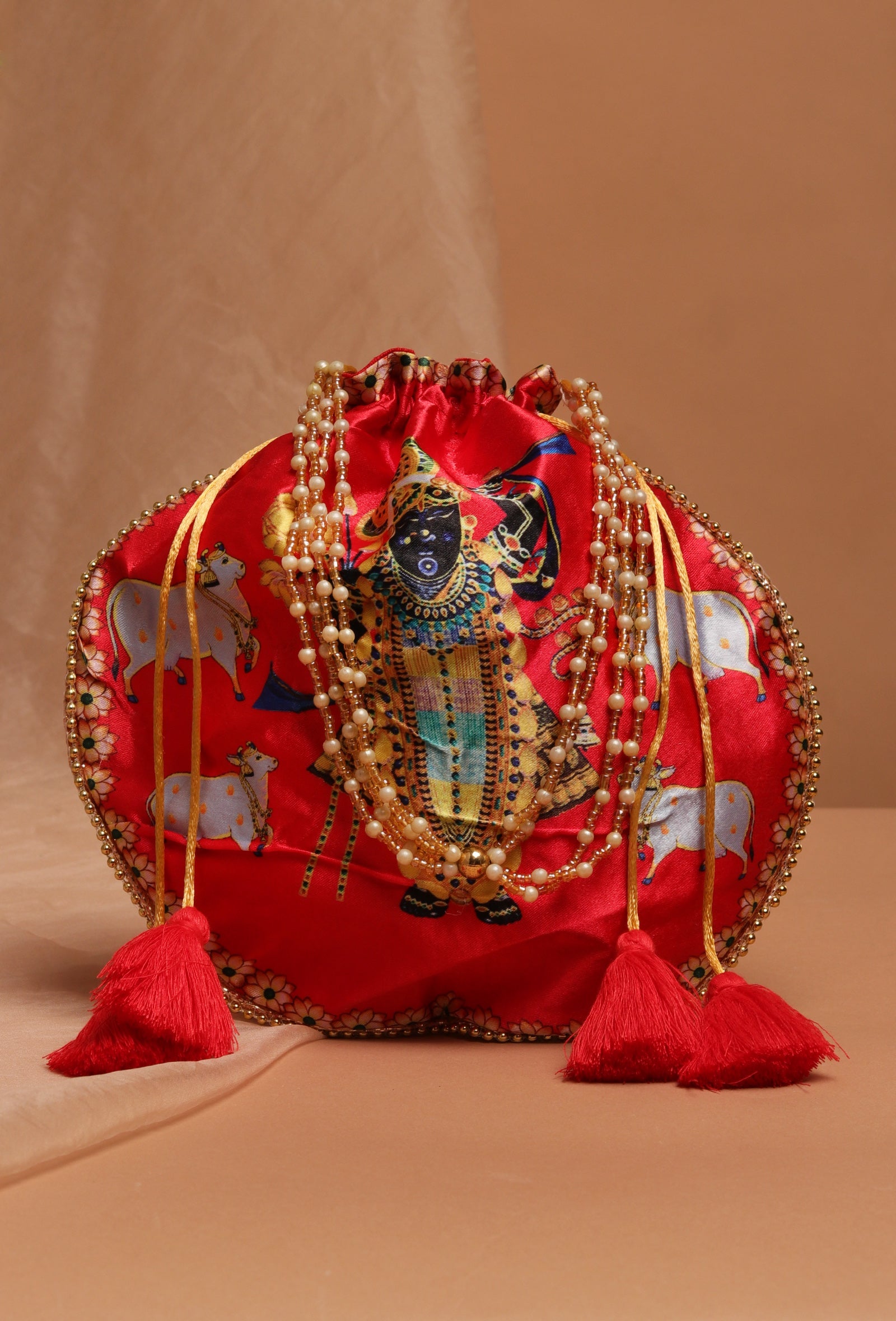 Luminous Red Shreenath Potli with Golden Glass Work dazzles with its vibrant red hue and intricate golden glass detailing. Featuring the revered Shreenath Ji print, this potli combines bold elegance with divine artistry, making it a stunning accessory for any special event.