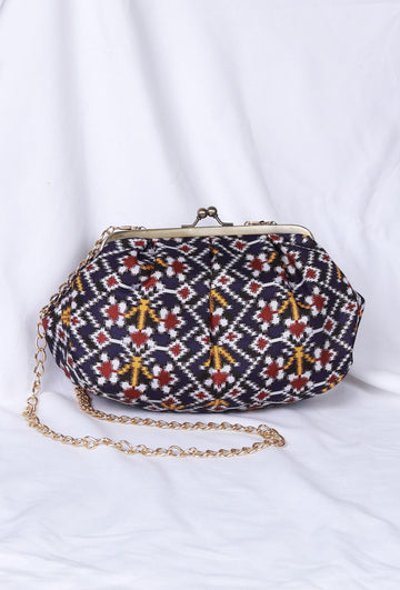 Flaunt this versatile golden and multi-colored gathered clutch with your favorite outfit and get all the attention you deserve. The classic patola prints make this piece exceptionally beautiful. It consists of one roomy compartment with a zip pocket and clasp...