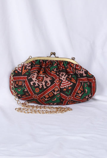 Green, Red & Multi Silk Patola Print Gathered Clutch