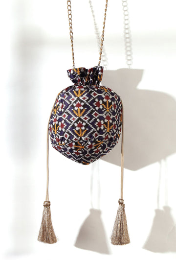 Chahat Blue, White & Multi Silk Patola Print Potli With Tassels