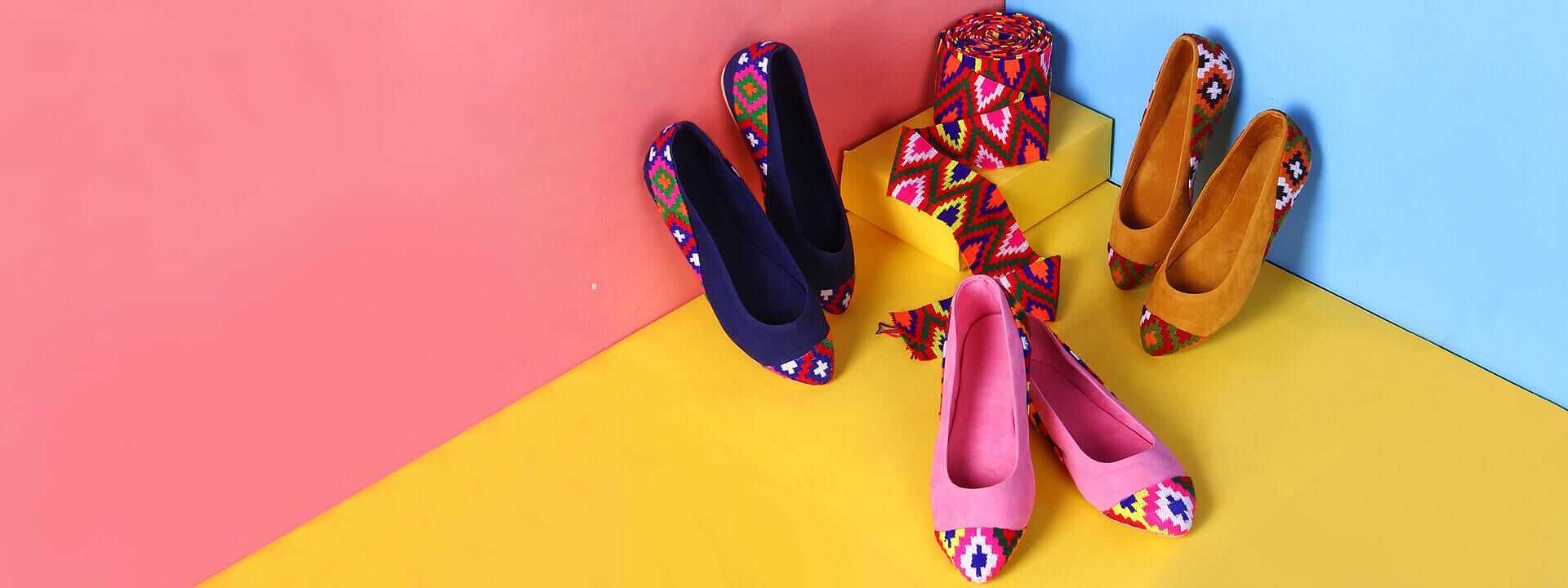 We offer you an extensive range of footwear which are inspired from some popular motifs like kalamkari, ajrakh, bagru, block print etc. and if you are looking for something which is more on a traditional side then you can also choose from the classic ballerina collection which have adornments on them such as dabka embroidery, zari embroidery, brocade fabric etc.