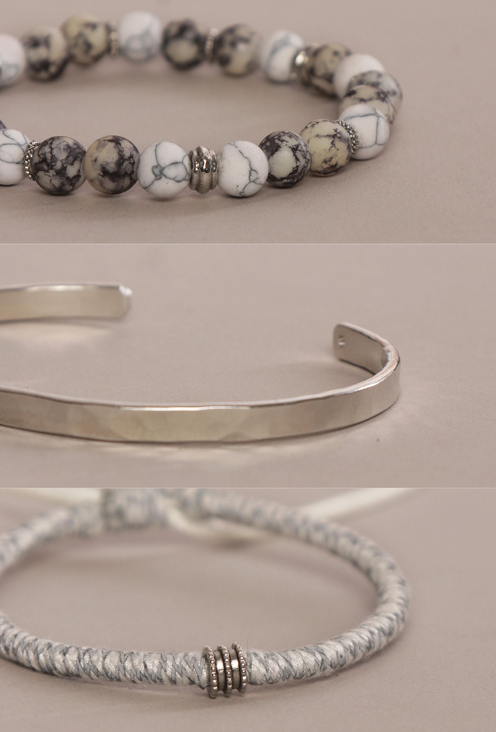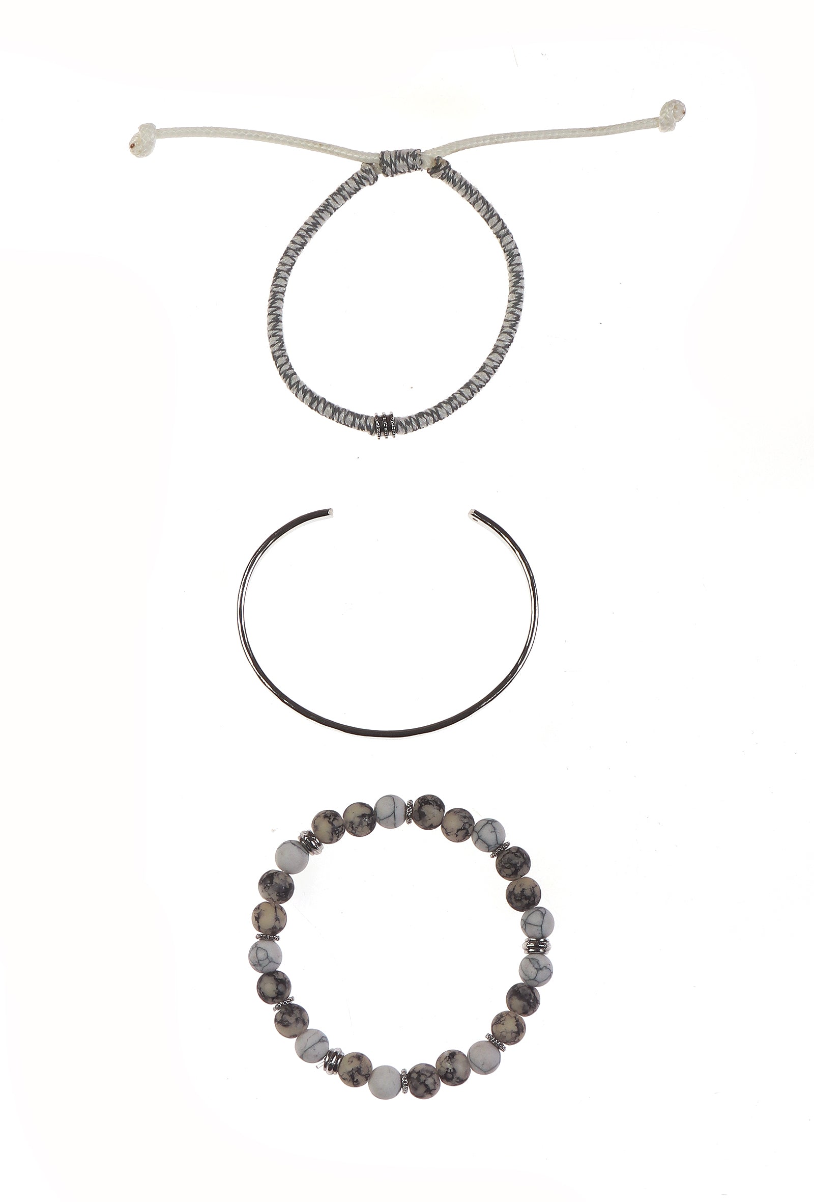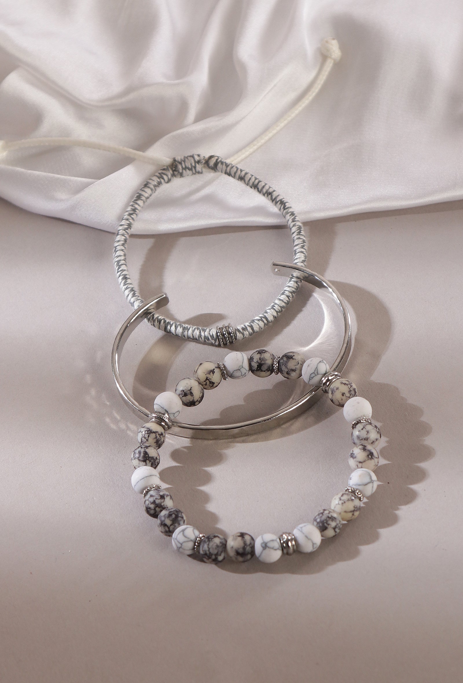 This bracelet set features a refined mix of White Howlite beads, a sleek silver cuff, and a braided rope bracelet—elements admired for their clean lines and subtle textures. Blending modern minimalism with effortless style, this chic bracelet set adds a graceful touch to everyday outfits and contemporary women's fashion.