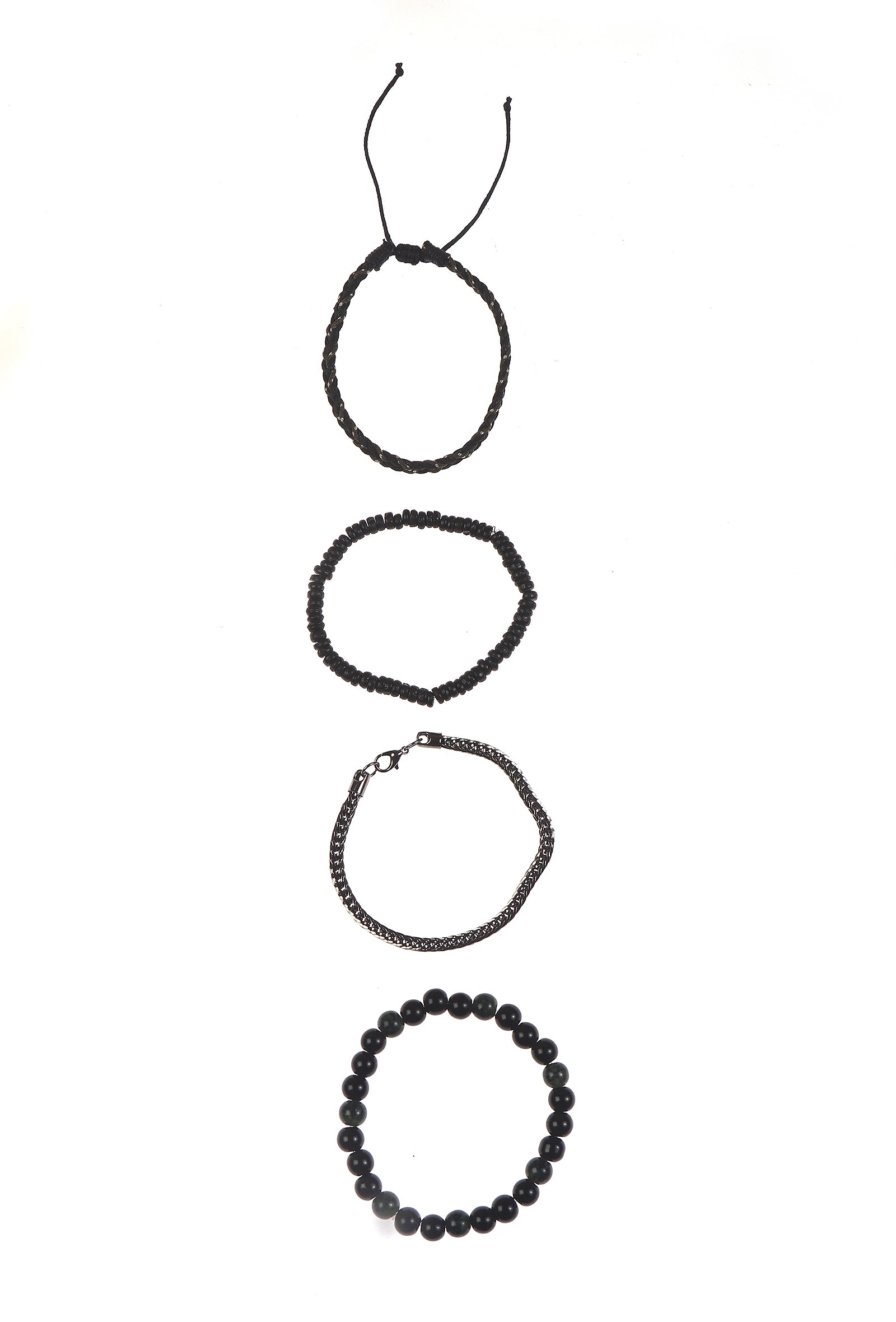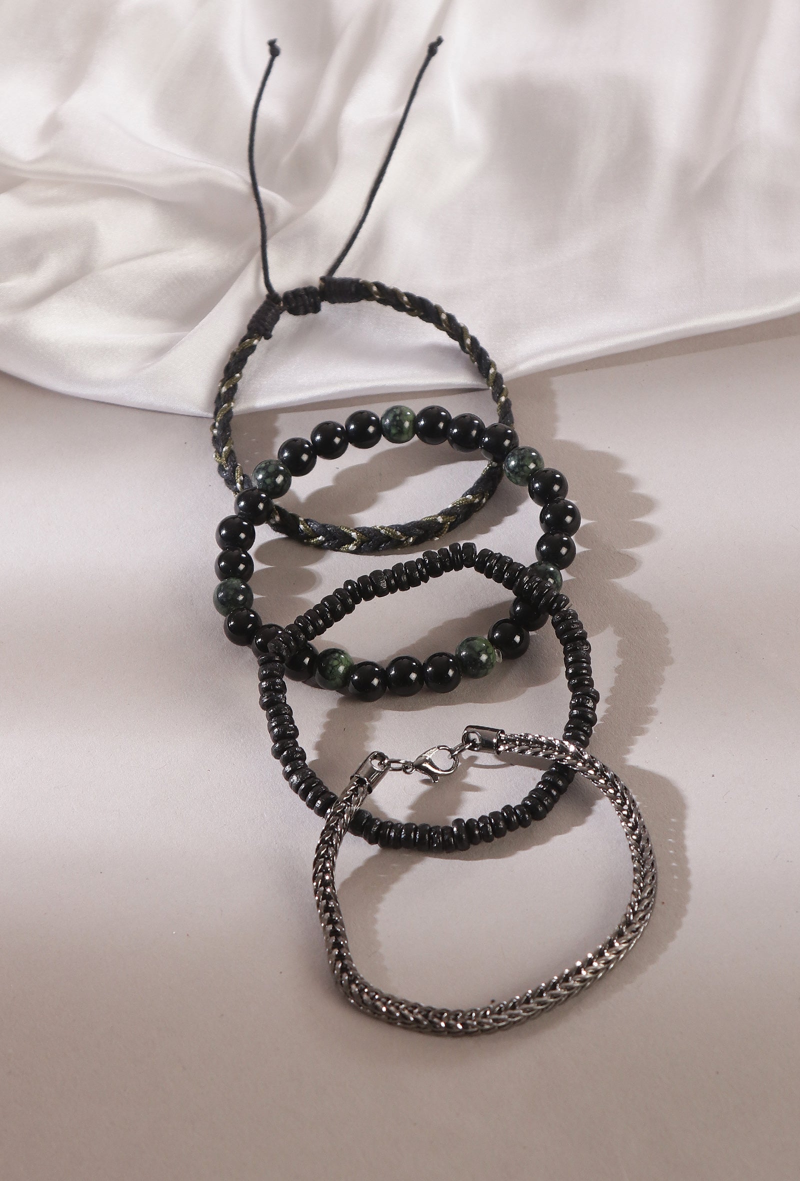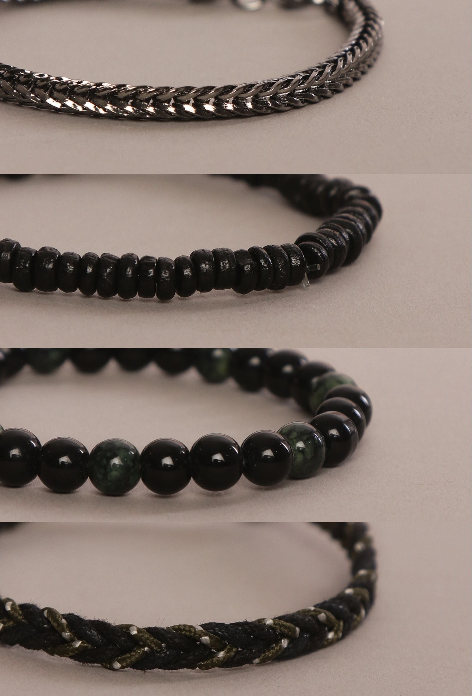 Silver Chain, Wood & Onyx Bracelet Collection - Set of 4