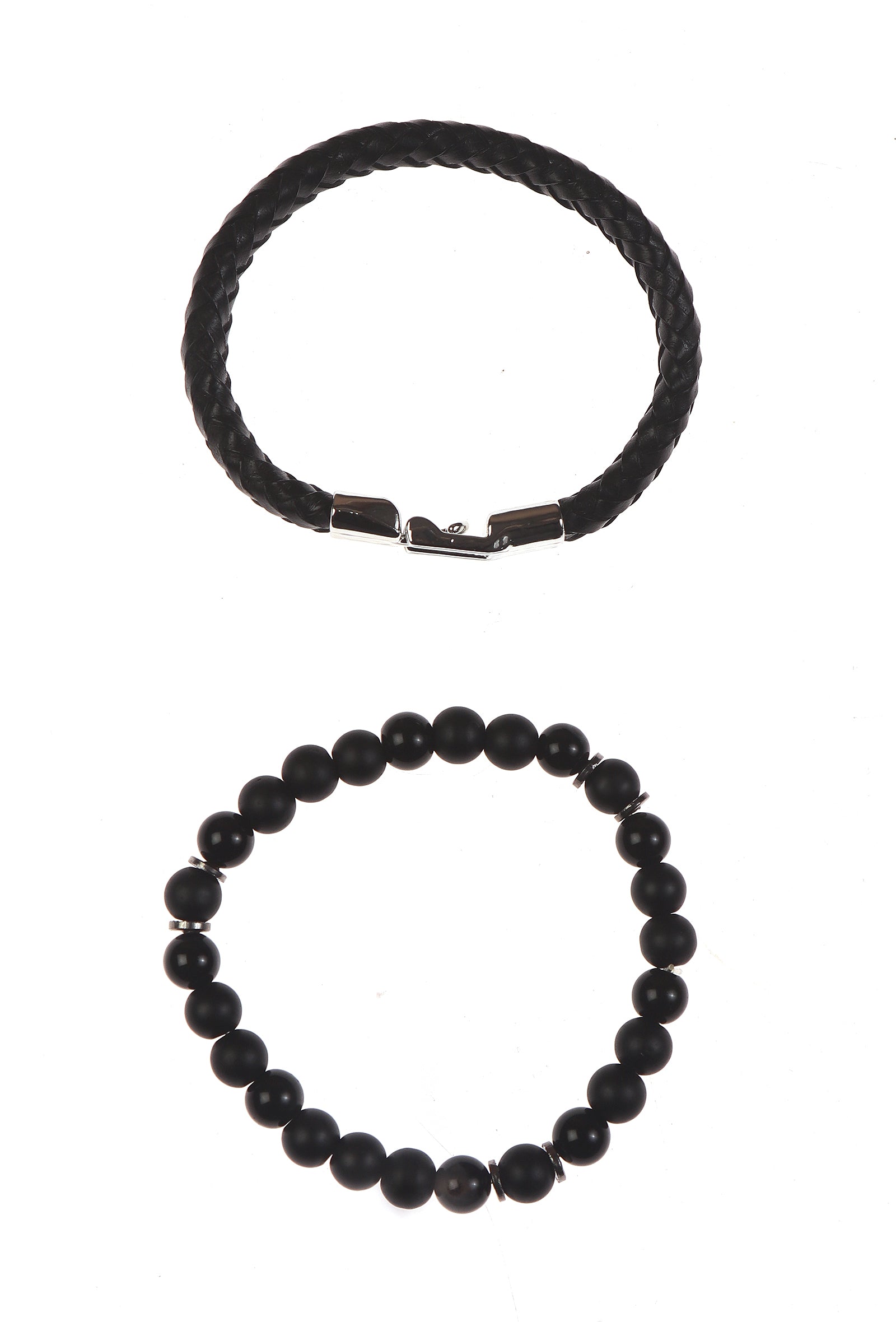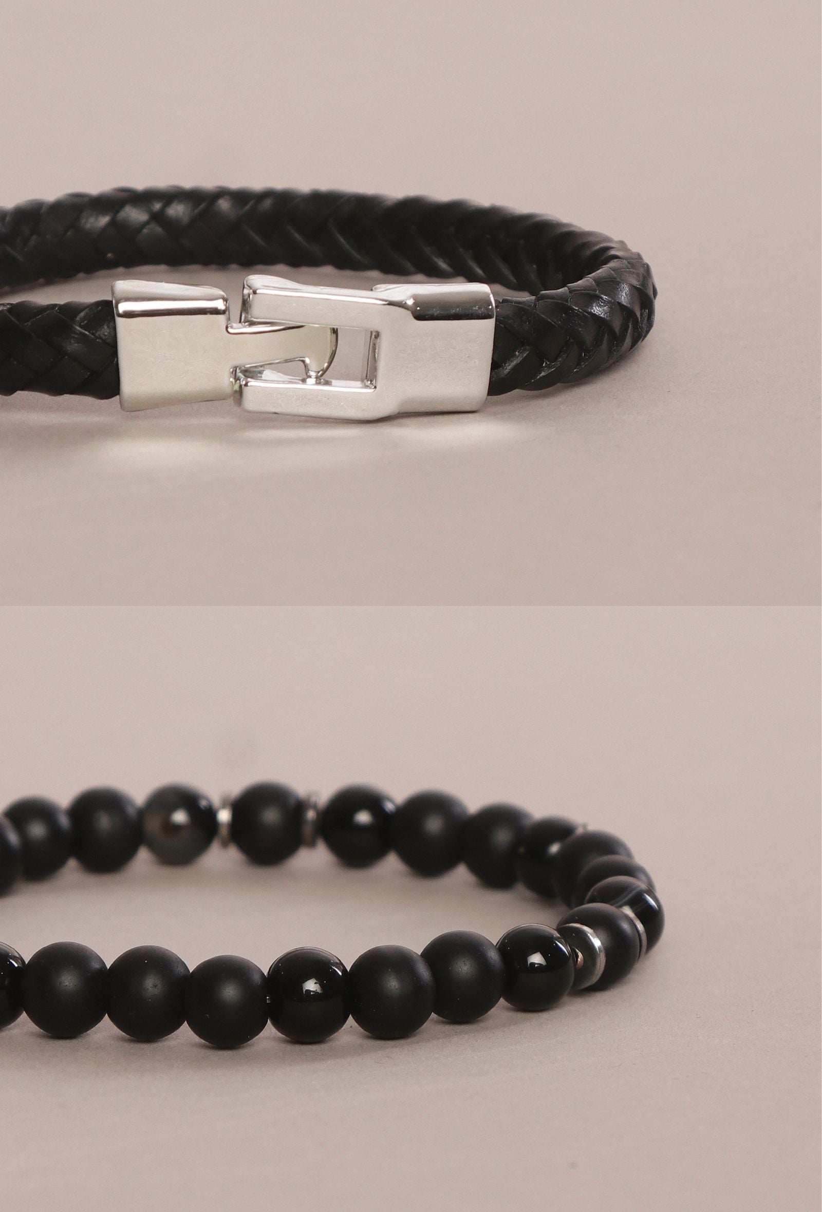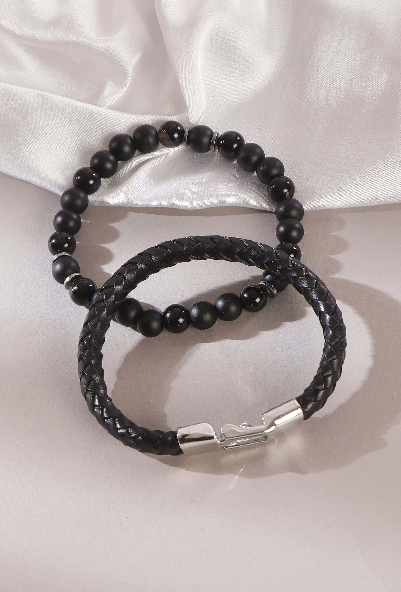 This bracelet duo features sleek braided leather with a stainless steel clasp paired with matte Black Onyx stone beads—elements admired for their bold textures and modern appeal. Symbolizing strength, confidence, and style, this bracelet set blends contemporary metal with natural stone for a versatile everyday accessory.