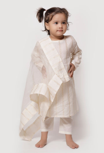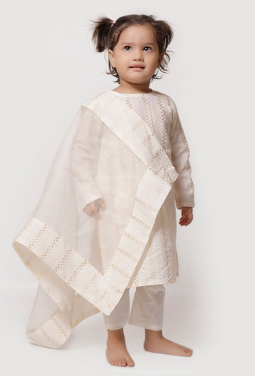 Aren't kids always chirpy and playful. Make their spring summer a little more comfortable with this set of 3. It features silver white malmal Kurti with Palazzo Pants and dupatta. This set has been crafted in extremely soft and lightweight...