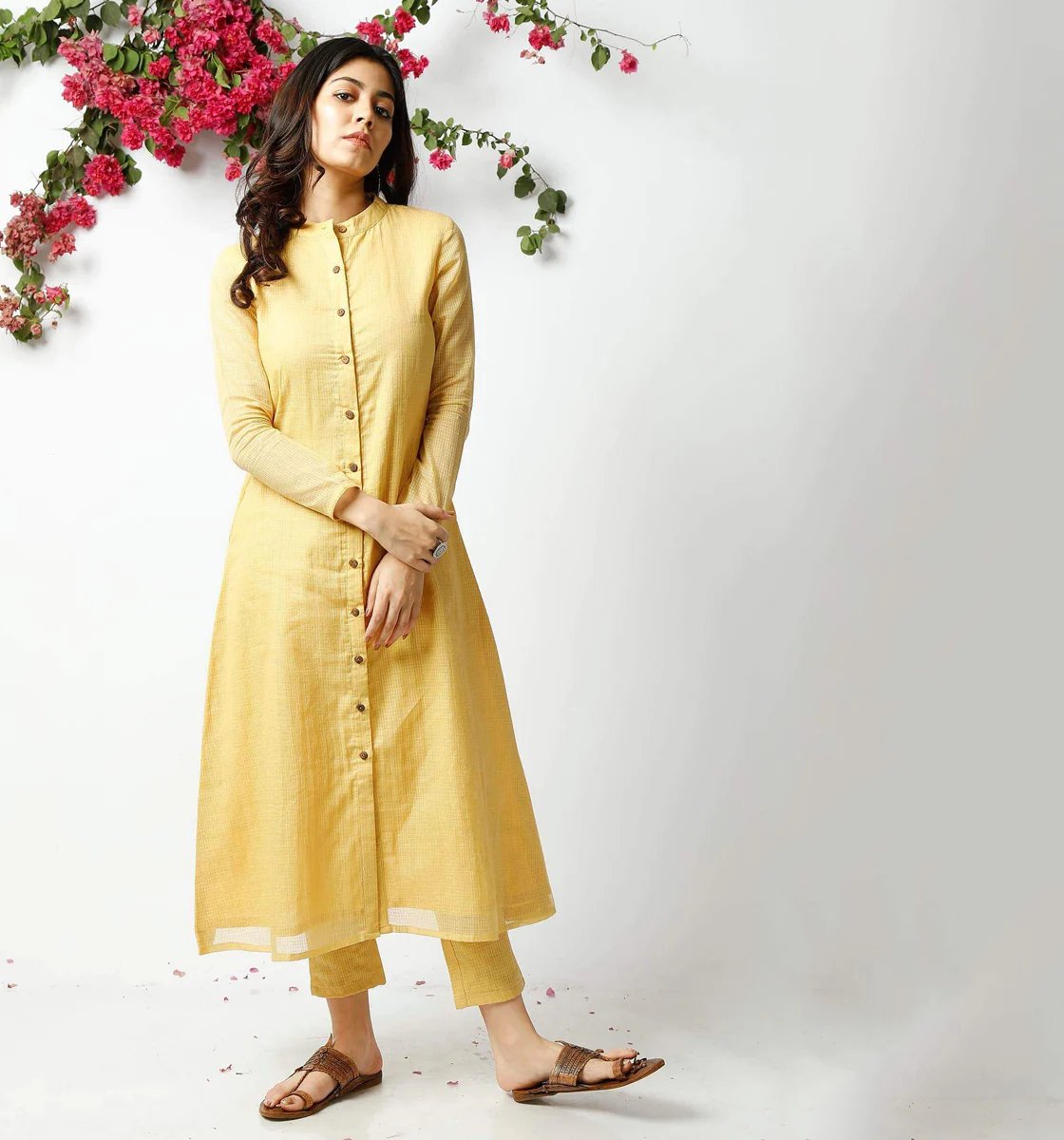 This light green cotton kurta with pintucks and a yoke on the front gathers on the sides. It is full sleeved, piped and has an A line fit, making it a light and easy piece of clothing for the summer.Dimension:...