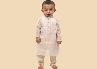 This beautiful off-white malmal kurta-pyjama is for your little ones. The malmal fabric is best for kids as it is super soft, made in 100% cotton and is uber comfortable.