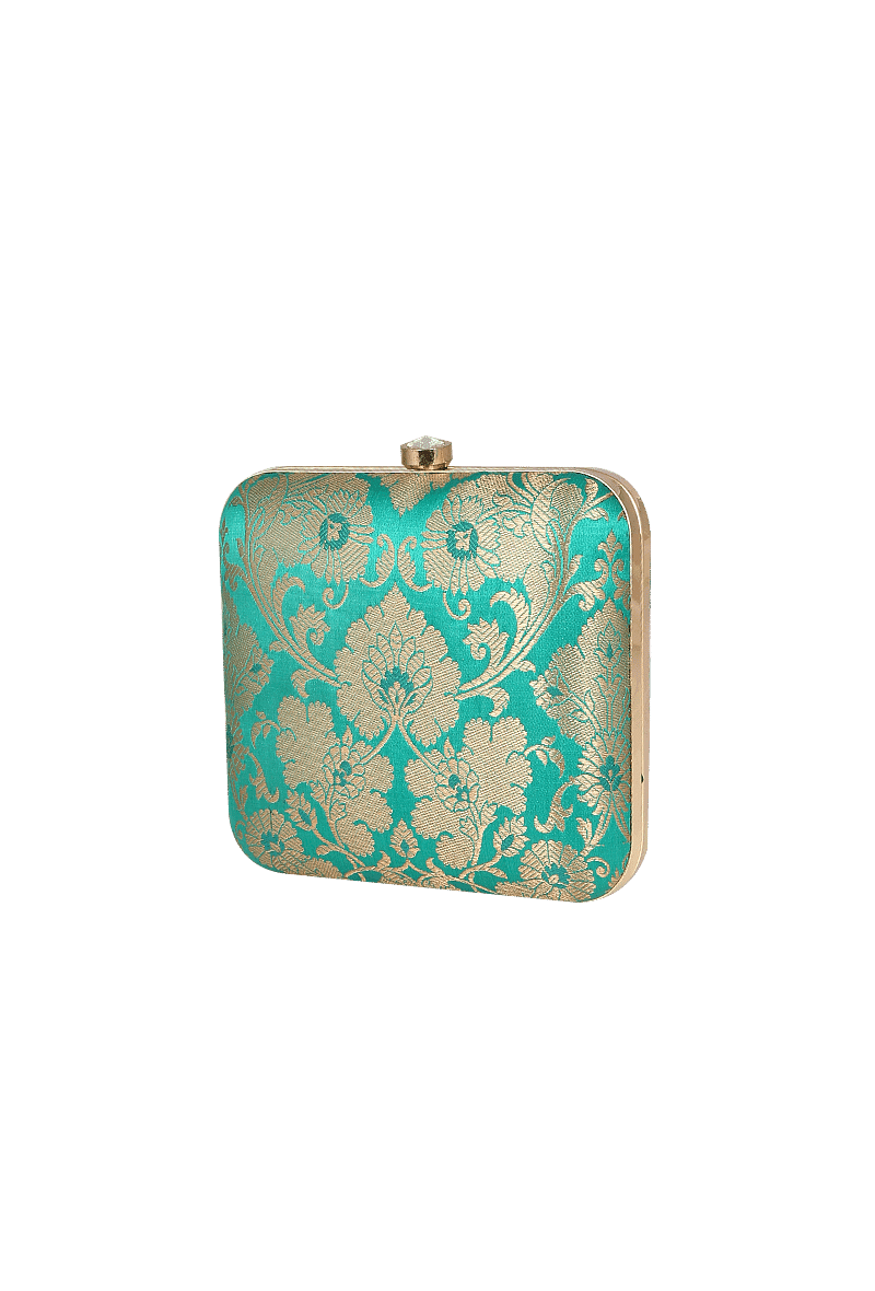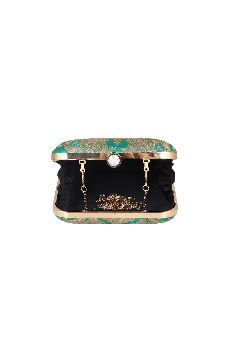 Designed aesthetically in brocade, this square box clutch is an ethnic classic for the weddings and festivities. It has a detachable metallic chain and an easy push lock opening with rhinestone detailing. The inner lining is made of rayon to provide a soft, sophisticated touch.