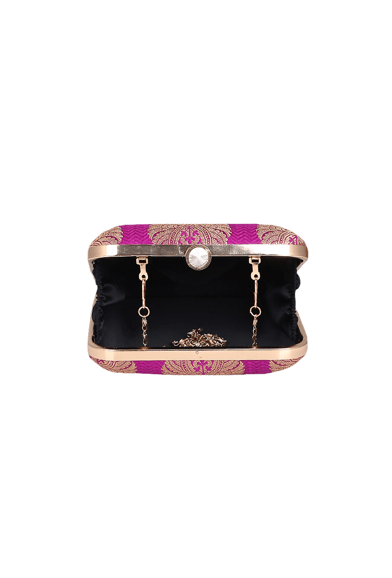 Designed aesthetically in brocade, this square box clutch is an ethnic classic for the weddings and festivities. It has a detachable metallic chain and an easy push lock opening with rhinestone detailing. The inner lining is made of rayon to provide a soft, sophisticated touch.