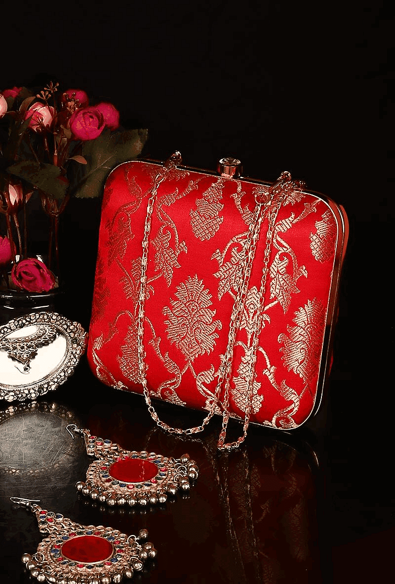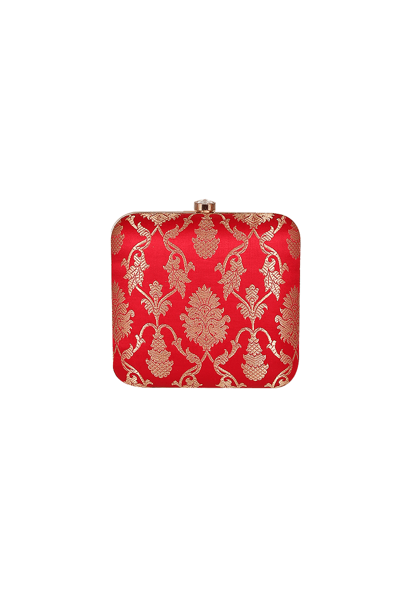 Red Brocade Box Clutch with Sling (6.5 X 2 X 6)
