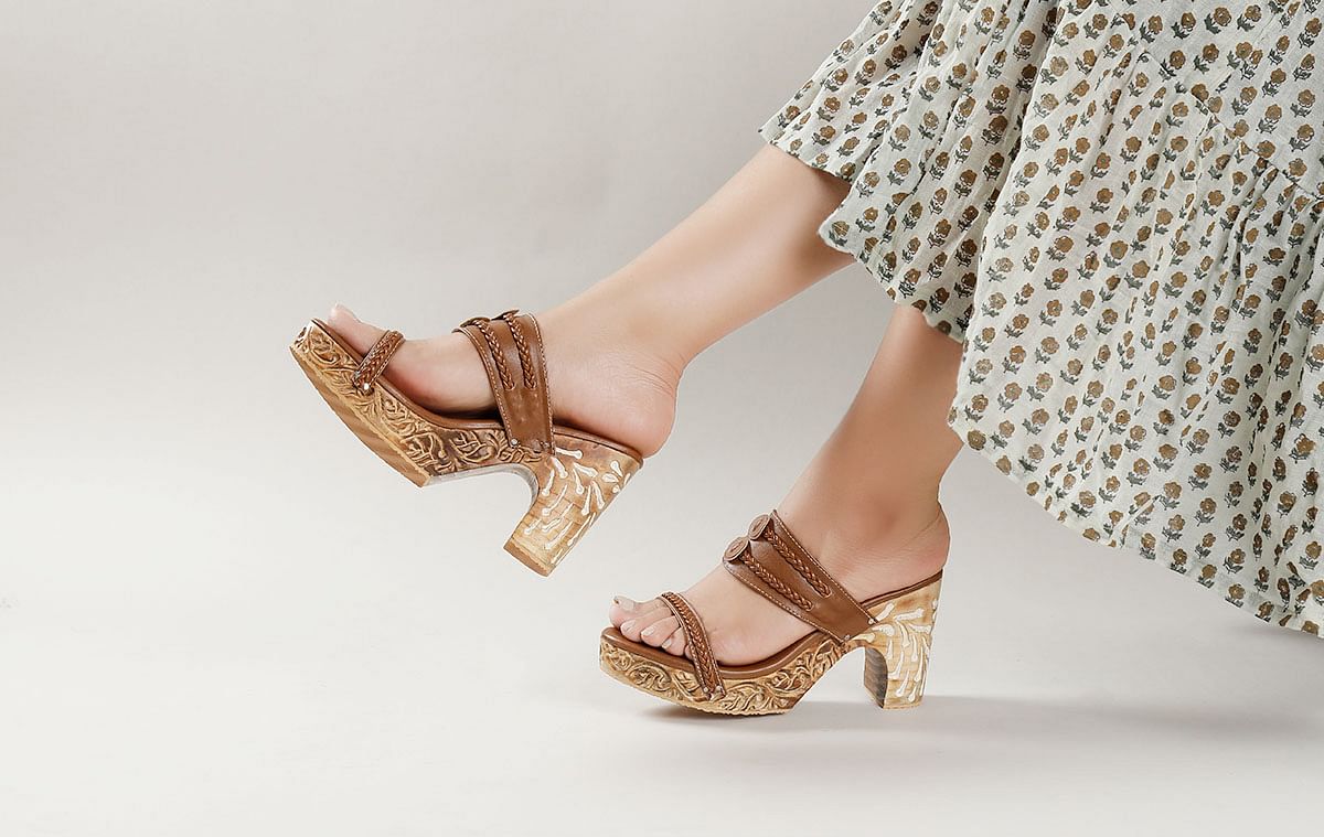 Give your foot style a boost with these trendy block heels. This tawny brown footwear with traditional wooden carving is handcrafted in intricate design, and cushioned footbed to provide you with utmost comfort. Take your quintessential dressing up a notch...