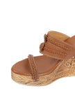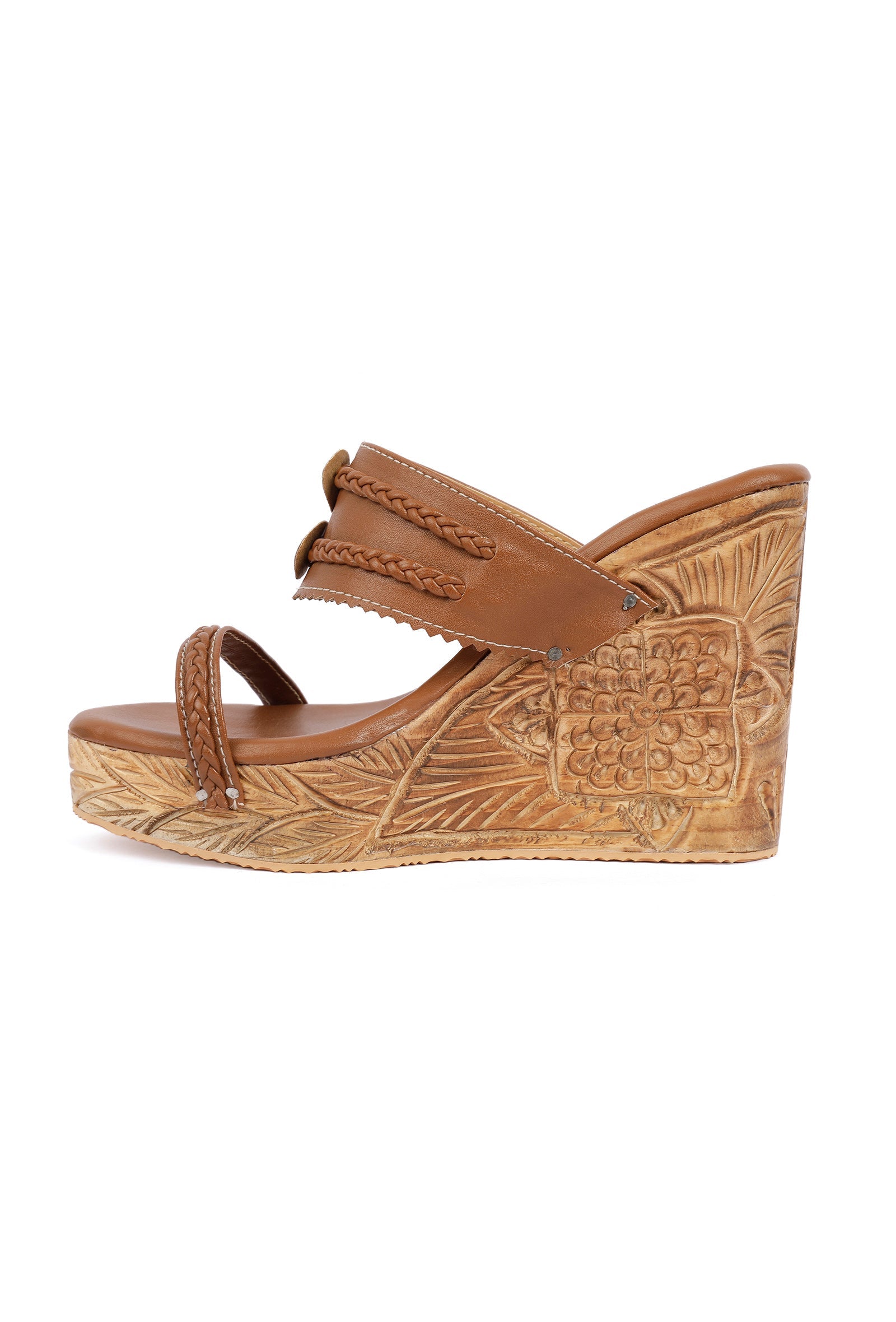 Caramel Brown Wooden Carved Braided & Textured Wedges