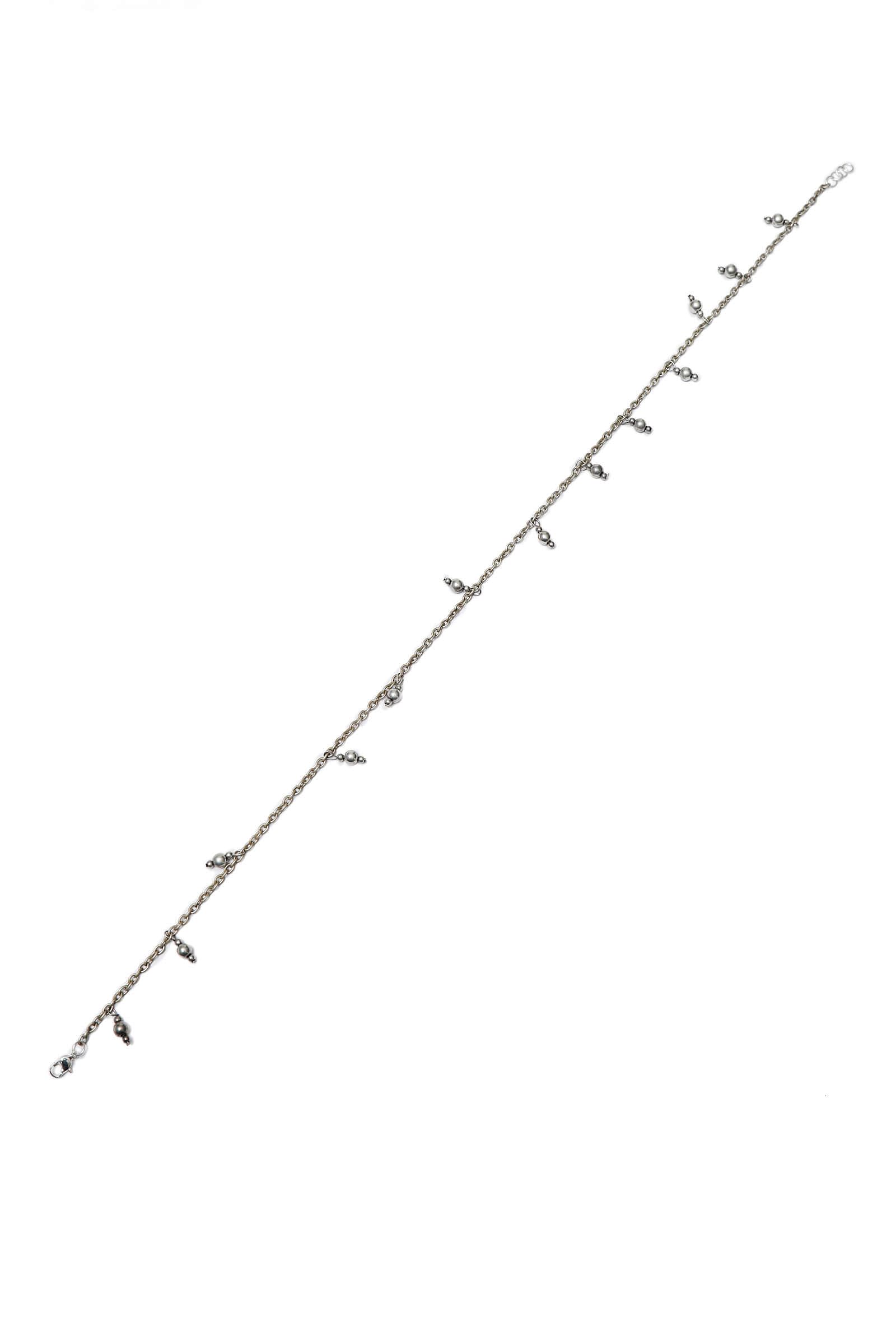 This pretty double layered anklet is adorned with small bells. It has been crafted with brass and has an antique silver plating on it. Light in weight, this beauty is suitable for everyday use. Note: Size may vary as these are Hand-made. Dimension In Inches: L: 8 inches Dimension In Centimeters: L: 20 cm Weight:10 gm Color:Silver Closure:Push Lock Material:brass chain Finish: oxidized Inspiration: high fashion chunk jewelry