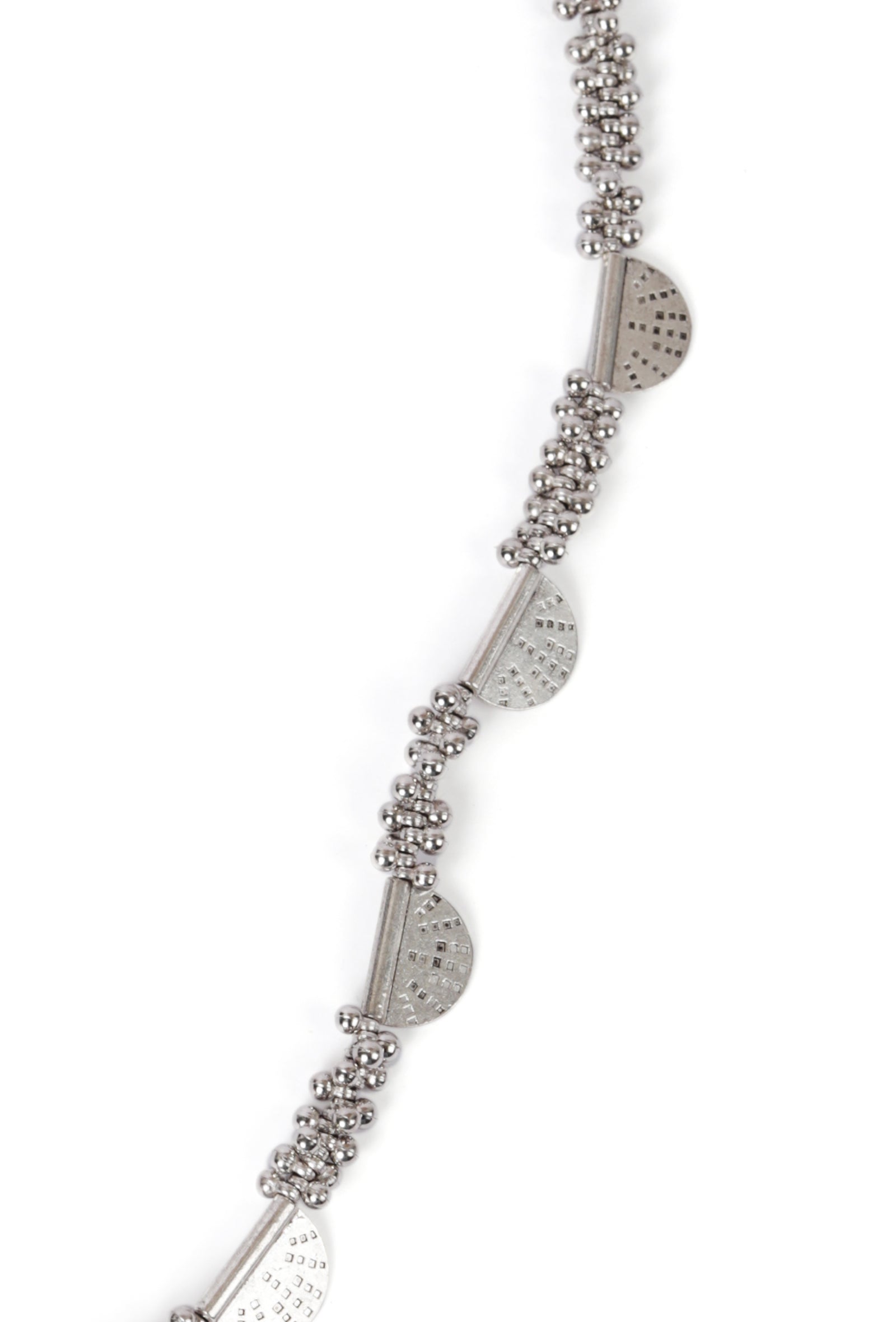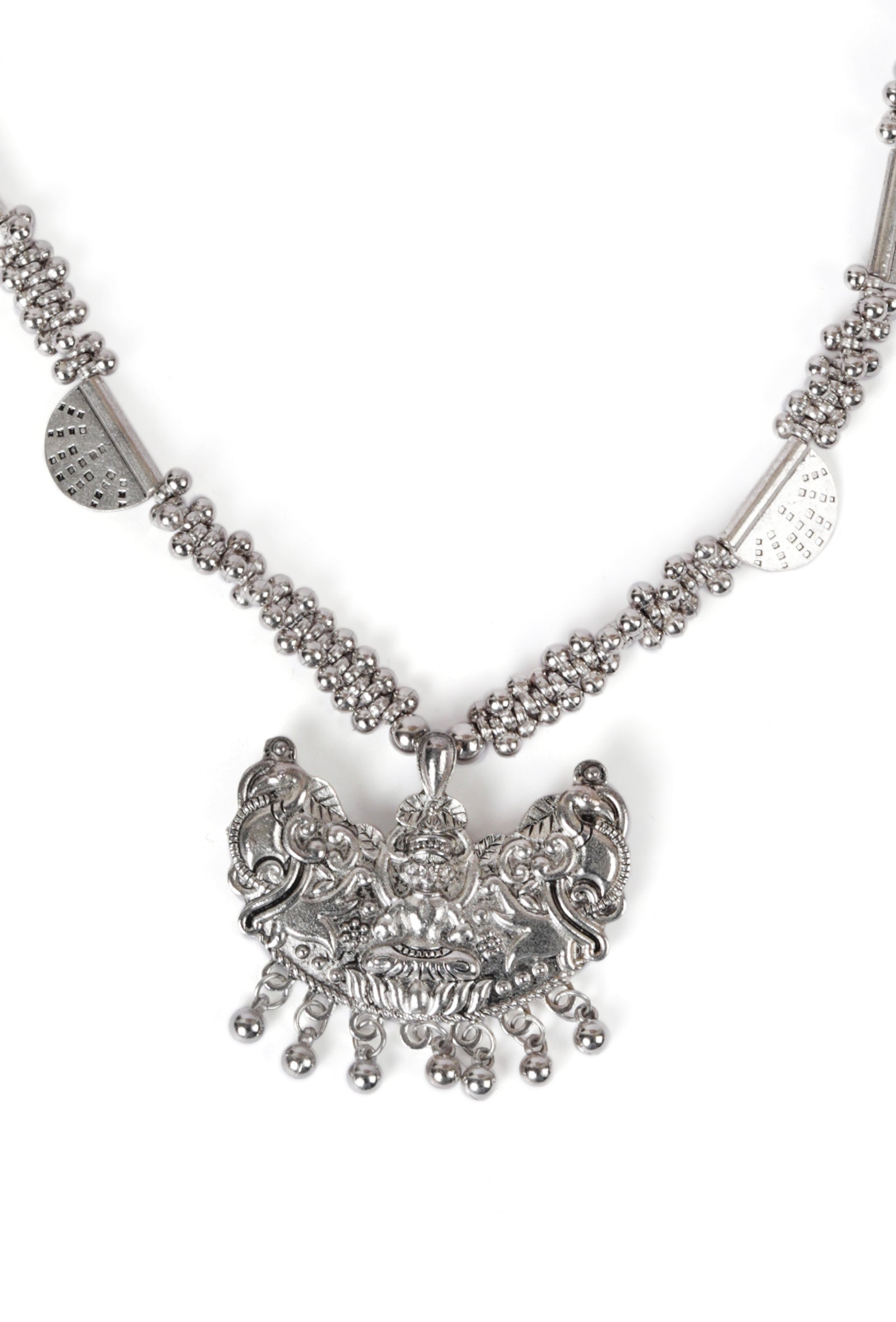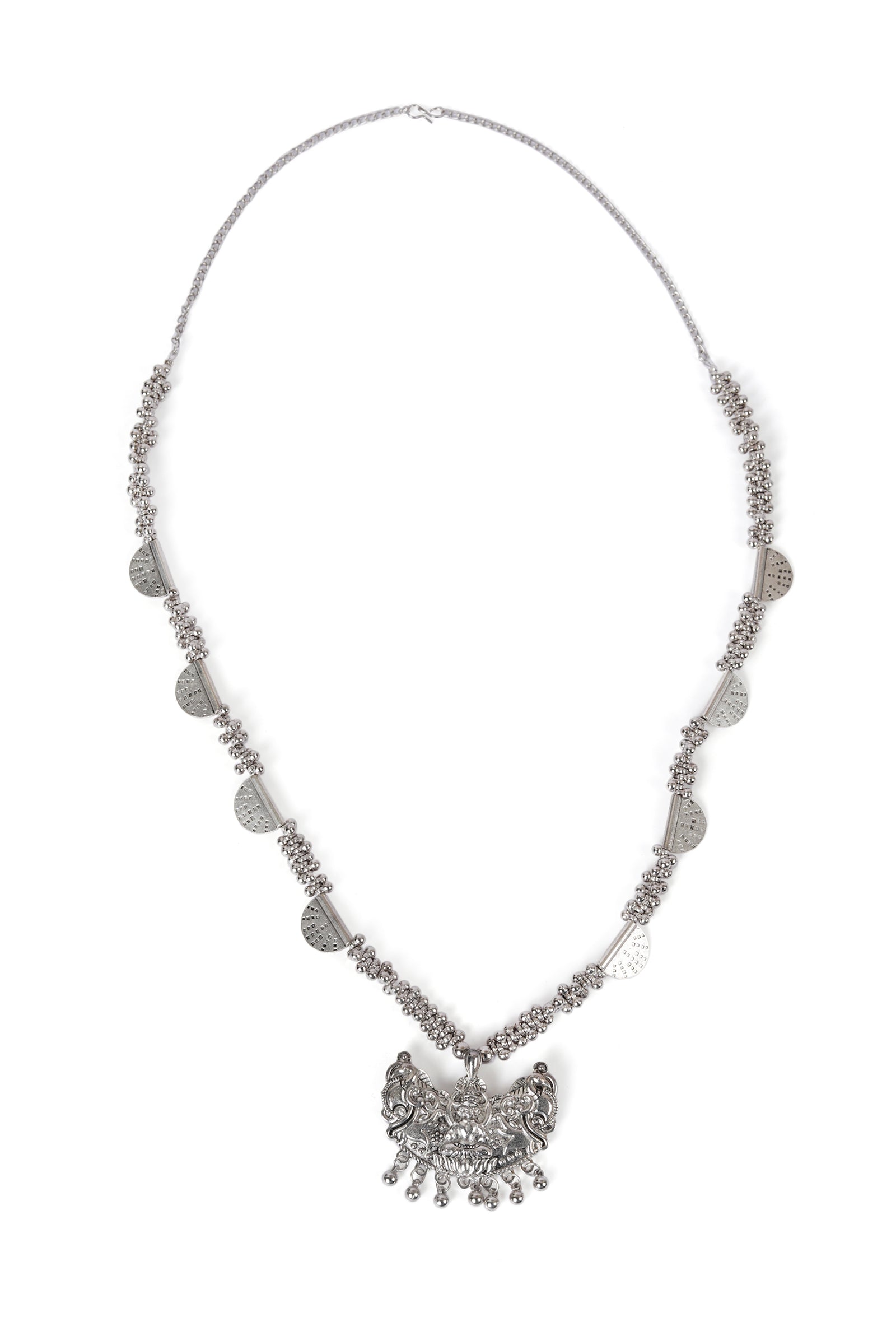 Adorn yourself in style with our German Silver Designer Pendant Charm Necklace. Featuring a Ghunghru Chain, this lightweight accessory combines elegance and charm for a versatile and chic look.