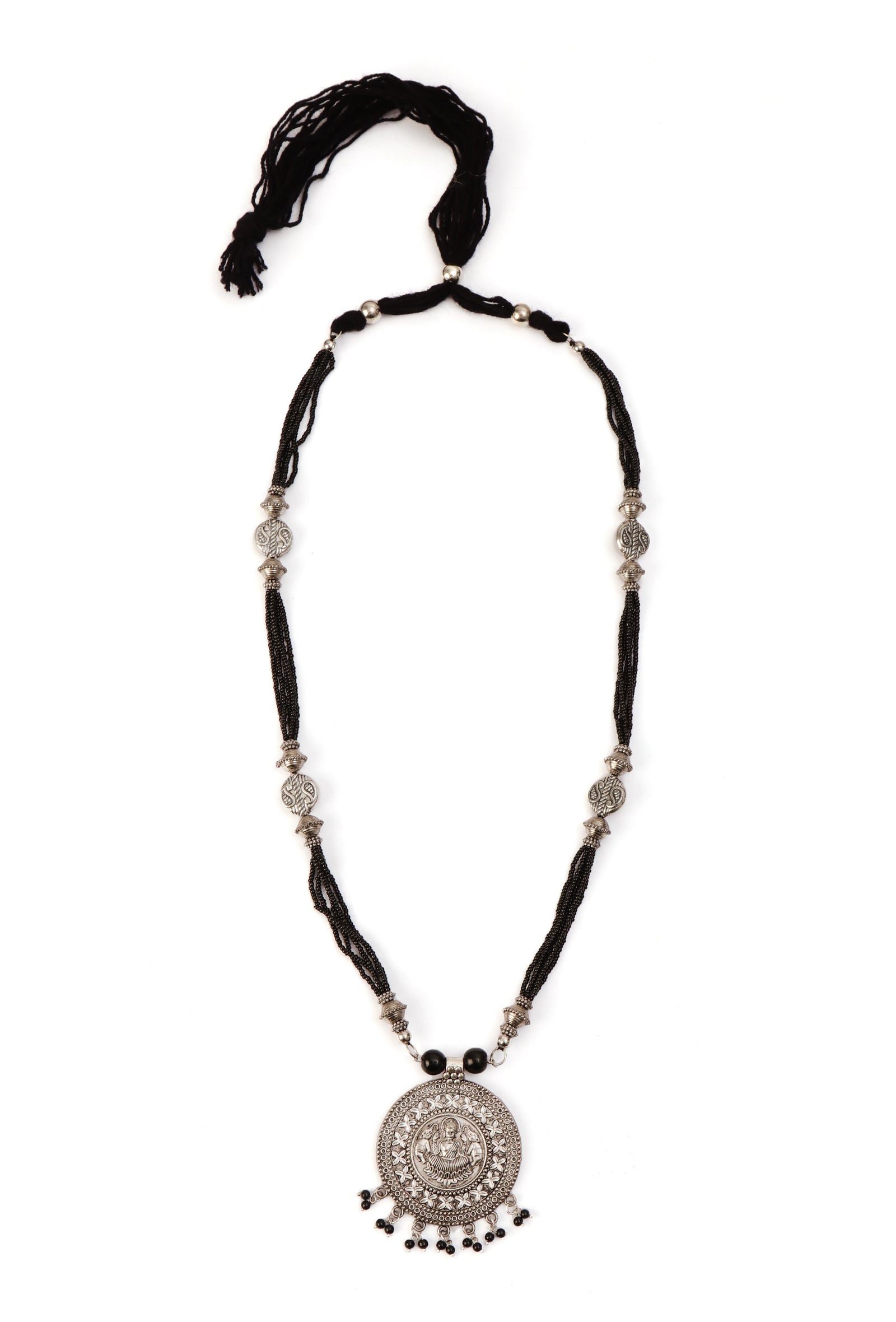 German Silver Lakshmi Pendant Necklace Set With Black Bead Dori & Jhumki