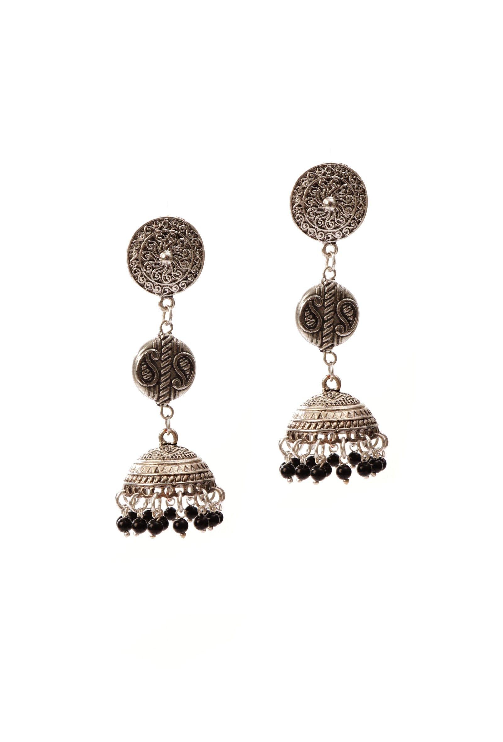Embrace classic charm with our German Silver Lakshmi Pendant Necklace Set. Featuring an intricately designed Lakshmi pendant paired with a black bead dori and matching jhumki earrings, this set combines traditional elegance with contemporary flair, perfect for any special occasion.