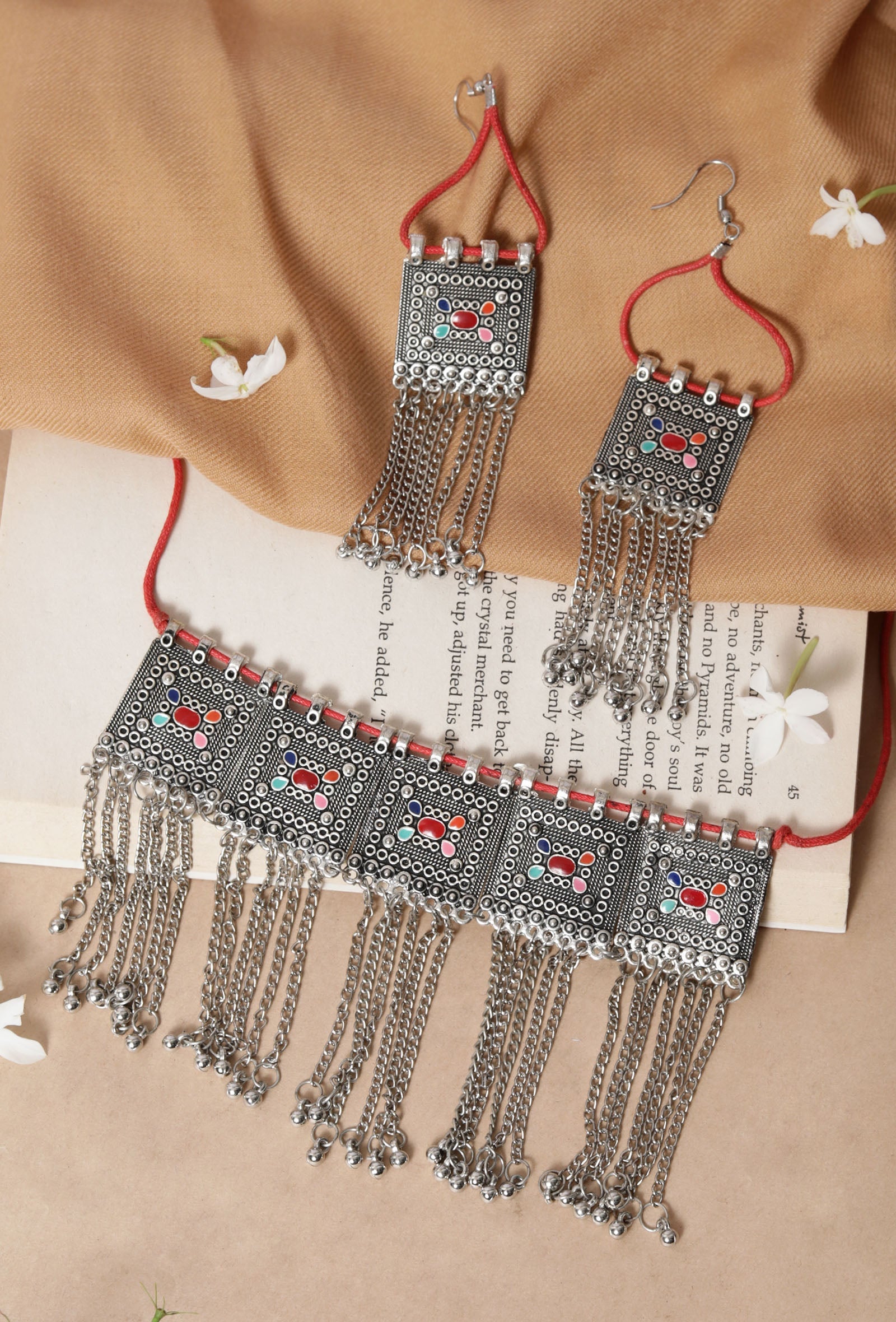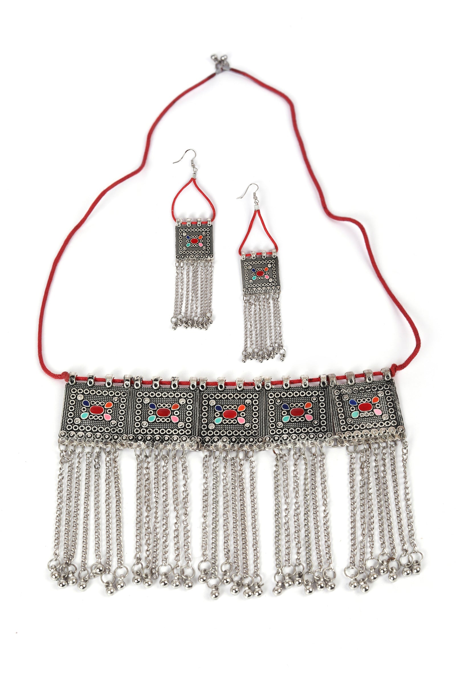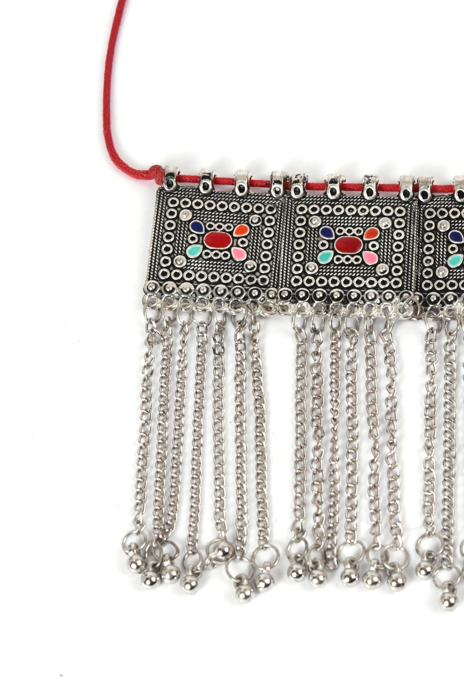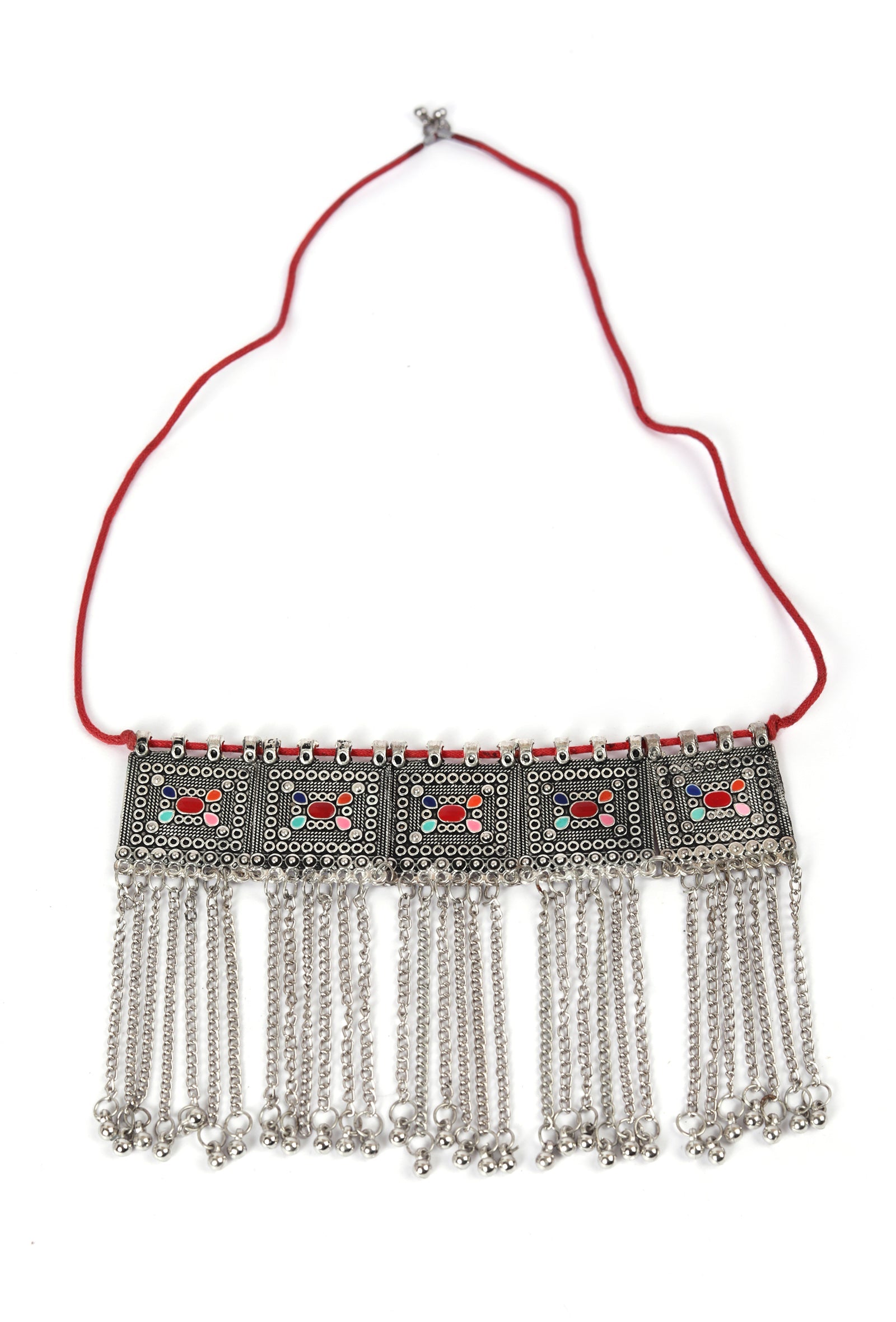 Adorn yourself with the charm of Multi Meena Chain Work Afghani Choker Necklace. This ethnic piece features intricate detailing, adding a touch of cultural elegance to your ensemble.