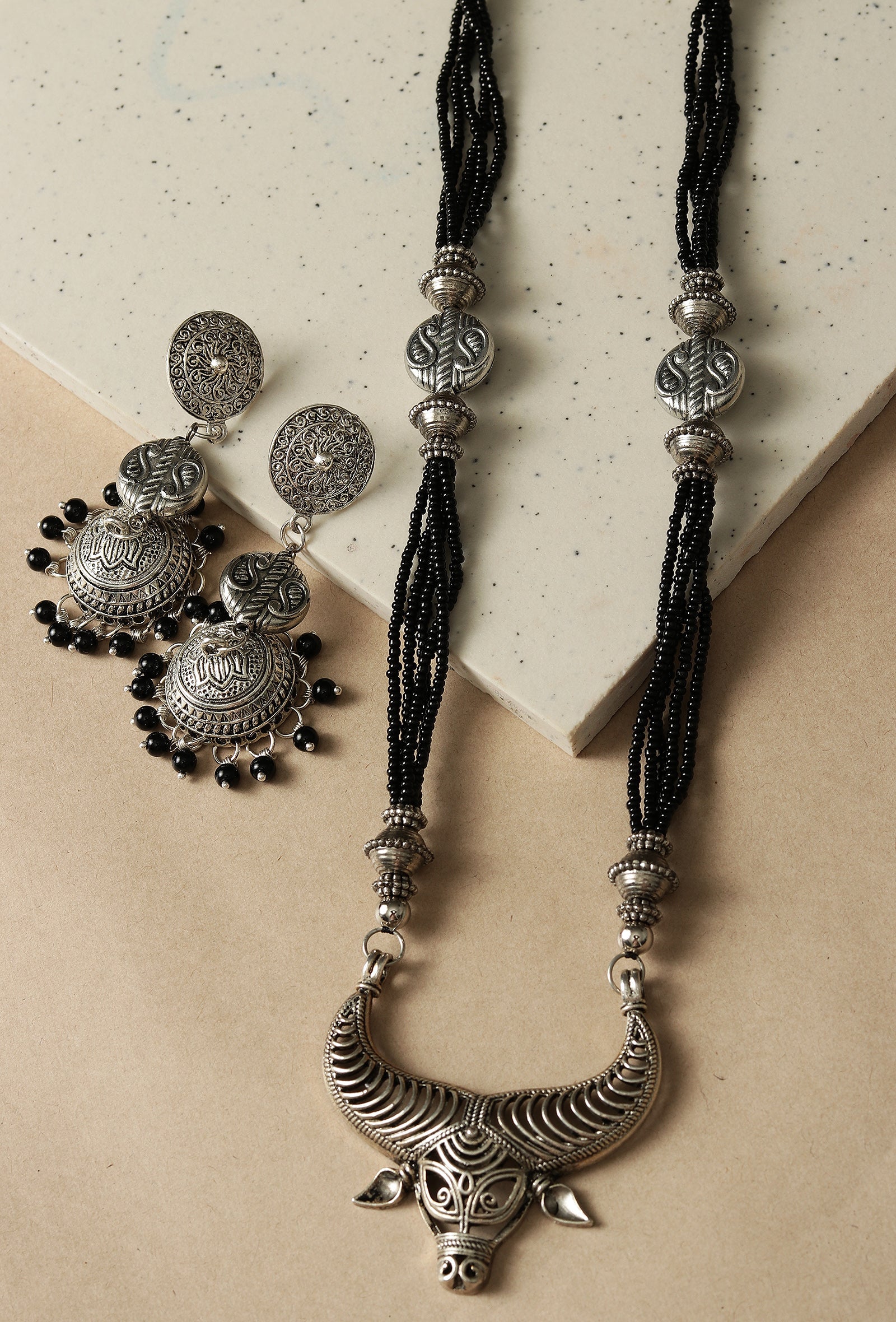 Channel divine strength with the Nandi Warrior Oxidised Set, inspired by Lord Shiva’s sacred bull. Crafted in antique oxidised finish, this bold and spiritual set blends mythology with fierce elegance—perfect for making a powerful statement at cultural events or everyday wear.