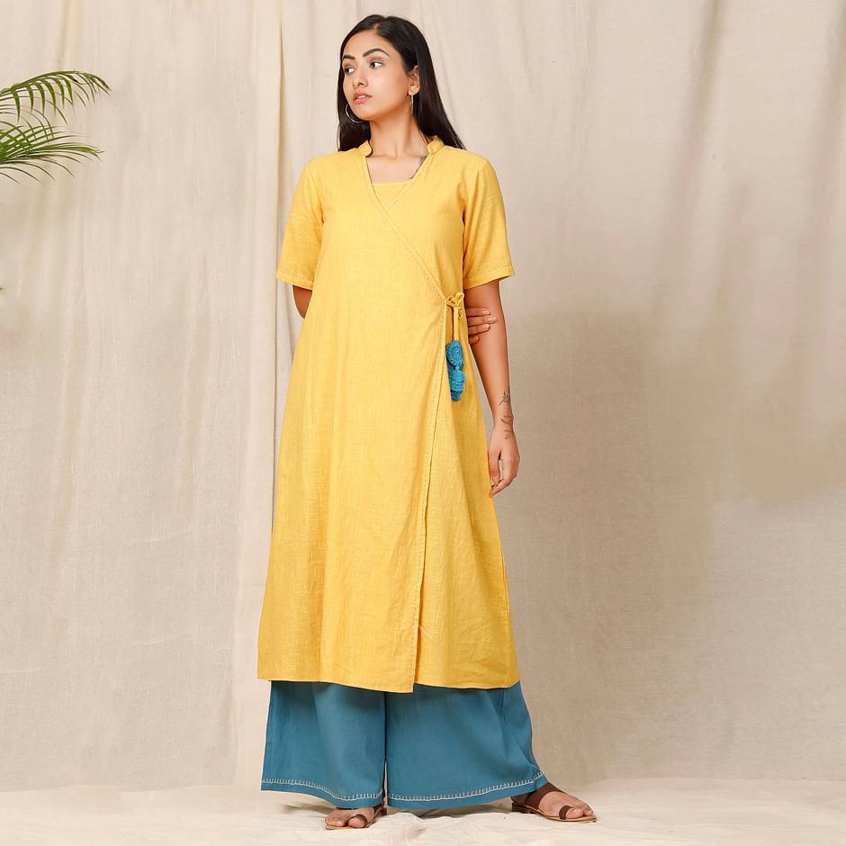 A lovely brown top that has been handcrafted using earthy cotton slub. This top features a pleated neckline and ruffled sleeves, along with Ikat piping details for a lovely traditional finish. Dimension: L:25.5 Inch, Length of sleeves:21 inch Color: Khaki...