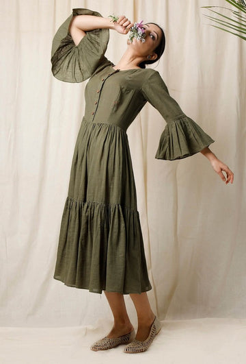This stunner of a dress has been handcrafted using dark green cotton slub. It features pintuck details at the shoulder and a beautiful pleated design. The slits at the sleeves and wooden buttons add a contemporary charm. Dimension:L:45 Inch, Length...