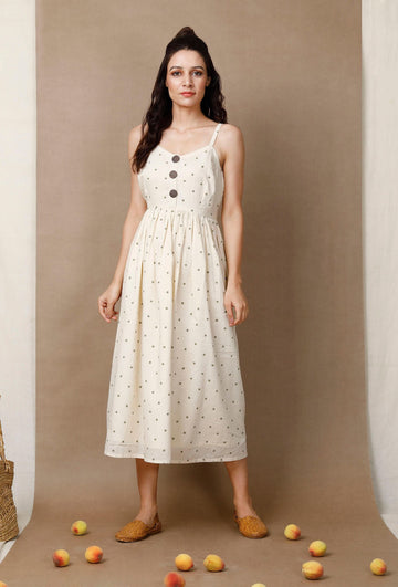 Travelling this summer? Don't forget to pack this fabulous noodle strap dress. Handcrafted in pure off white cotton, this dress features a hand block printed design with coconut shell buttons to make a serious style statement. Dimension: L:45 Inch Color:...