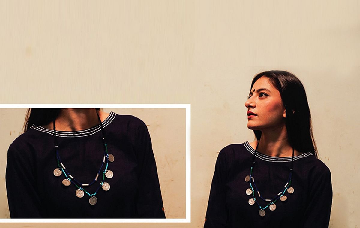 Borrowing inspiration from tribal accessories, this necklace has been handcrafted in black tread and feature German Silver coin embellishments. Offering a raw appeal, this necklace can be worn with pastel summer colours. Dimension: L: 14 inch, Weight: 149 gm Color:...