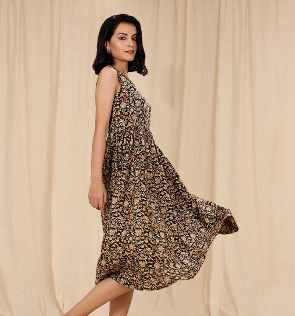 This classic and elegant Cotton kalamkari dress with tie up detailing has all the potential of being an essential in your wardrobe. A beautiful combination of prints and color, this sleeveless dress with V neck and hand embroidery is a...