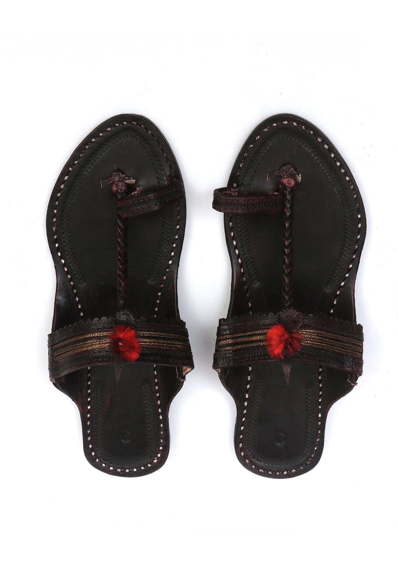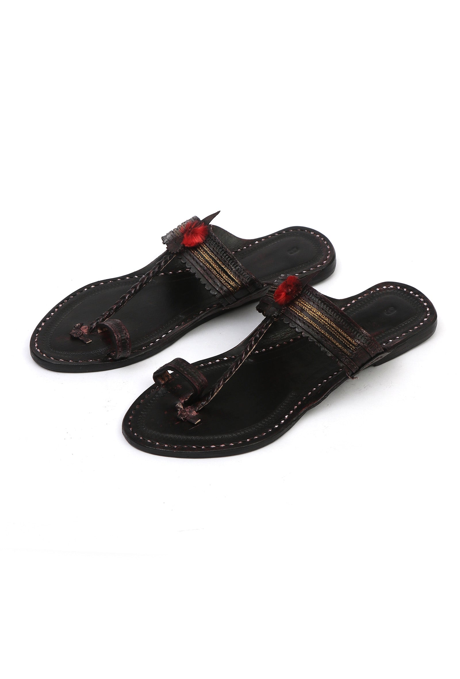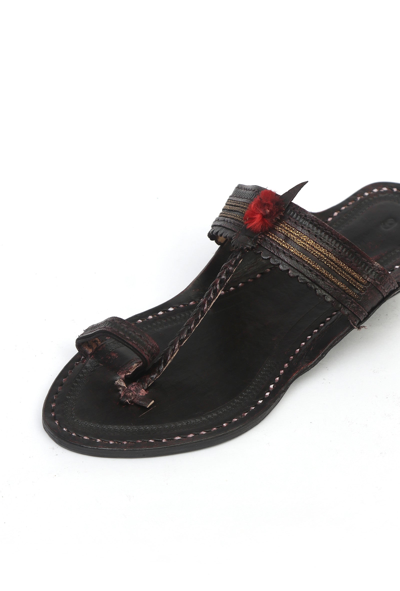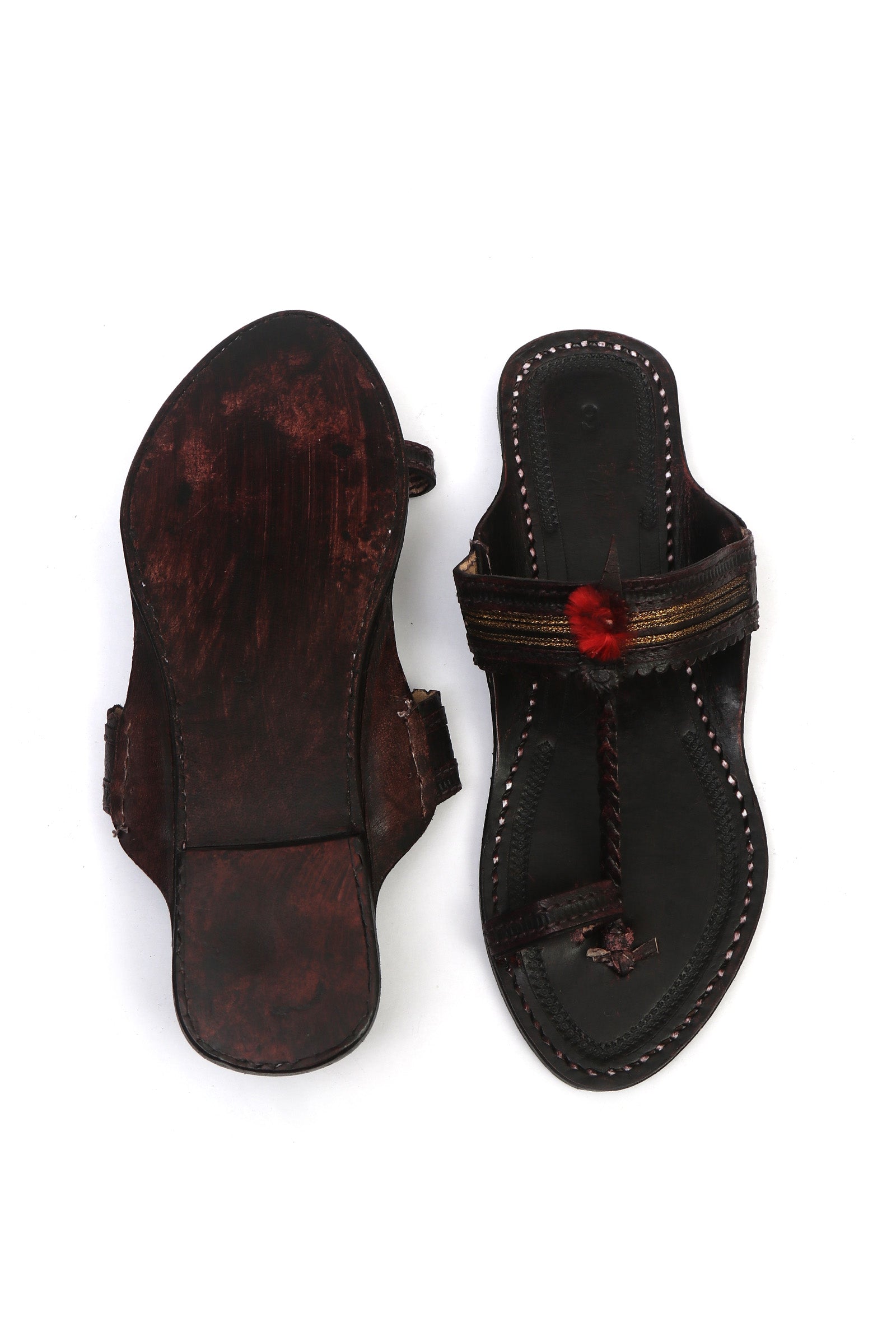 Rooted in tradition, these handcrafted Kolhapuri sandals showcase delicate gold-weave detailing with an elegant toe-ring silhouette. Earthy tones and artisanal finesse come together, making them perfect for festive occasions and refined everyday ethnic styling.
