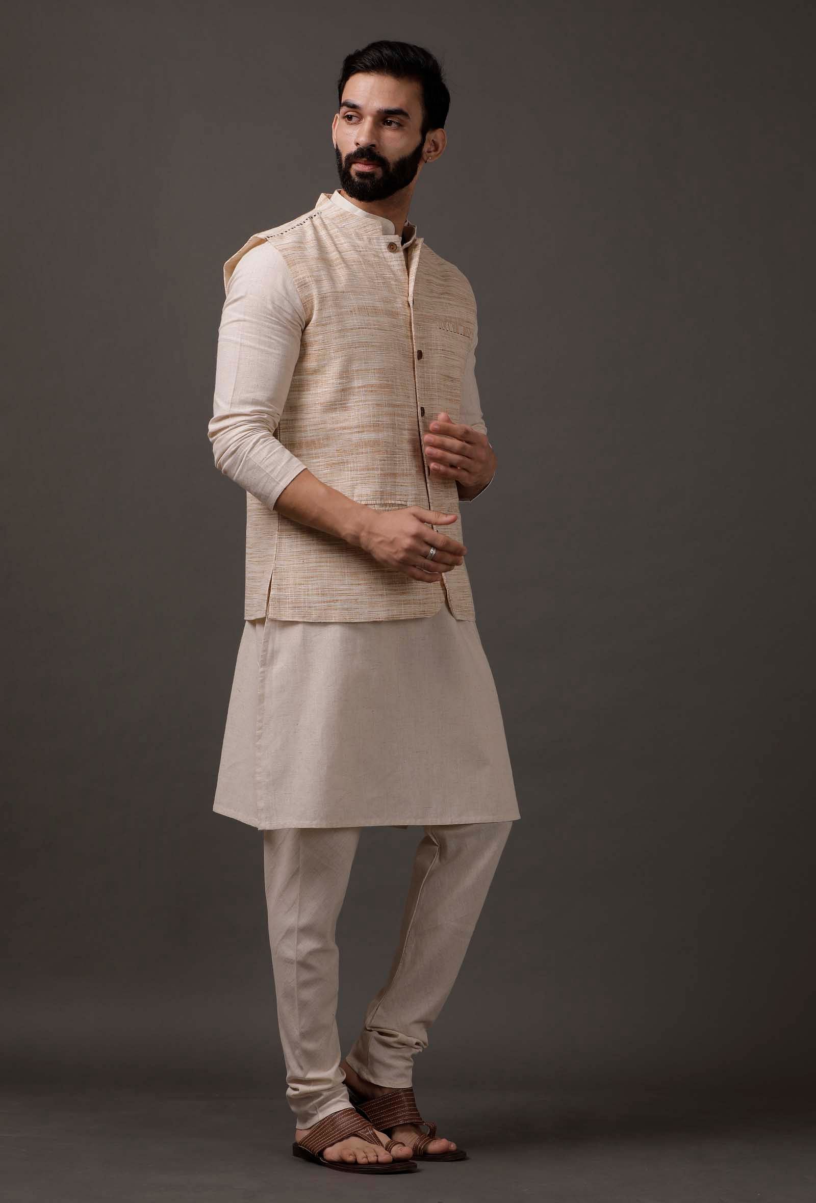 Set of 3: Beige Kurta pajama with Beige Waist Coat