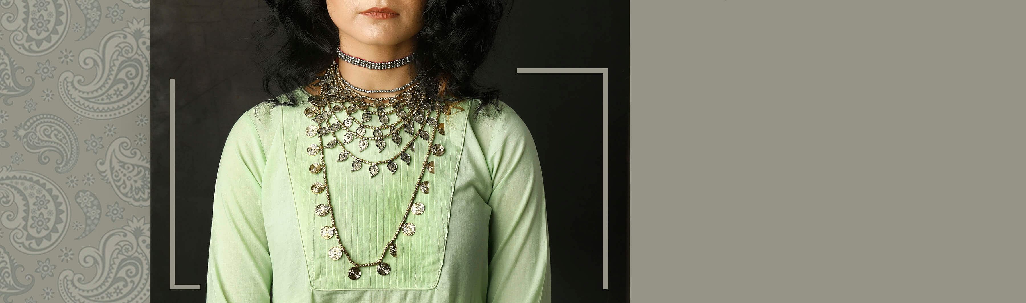 The perfect piece of jewellery for those who love rustic elegance. Inspired by the age-old Dhokra metal casting technique of India, this necklace features German silver paisley embellishments on two strands and a beaded chain in the third. Dimension: L:5.5...