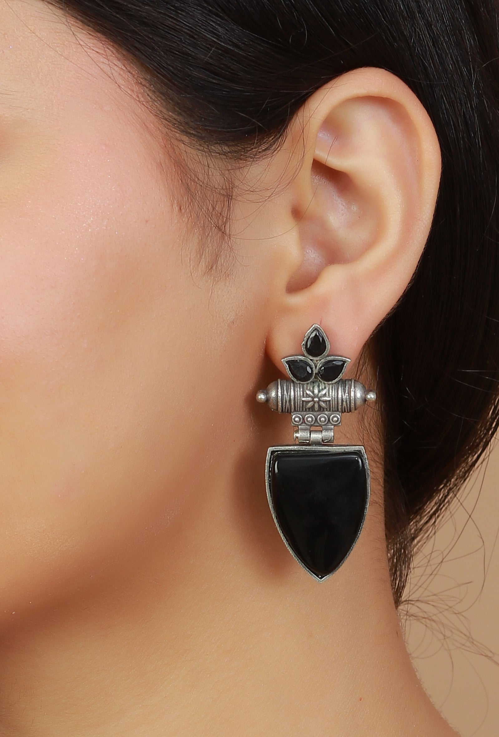 Bold and striking, Noir Tribal Shield earrings feature a powerful shield-inspired silhouette in a deep black finish. Designed to make a statement, they blend tribal influences with modern edge, perfect for elevating contemporary and fusion looks.