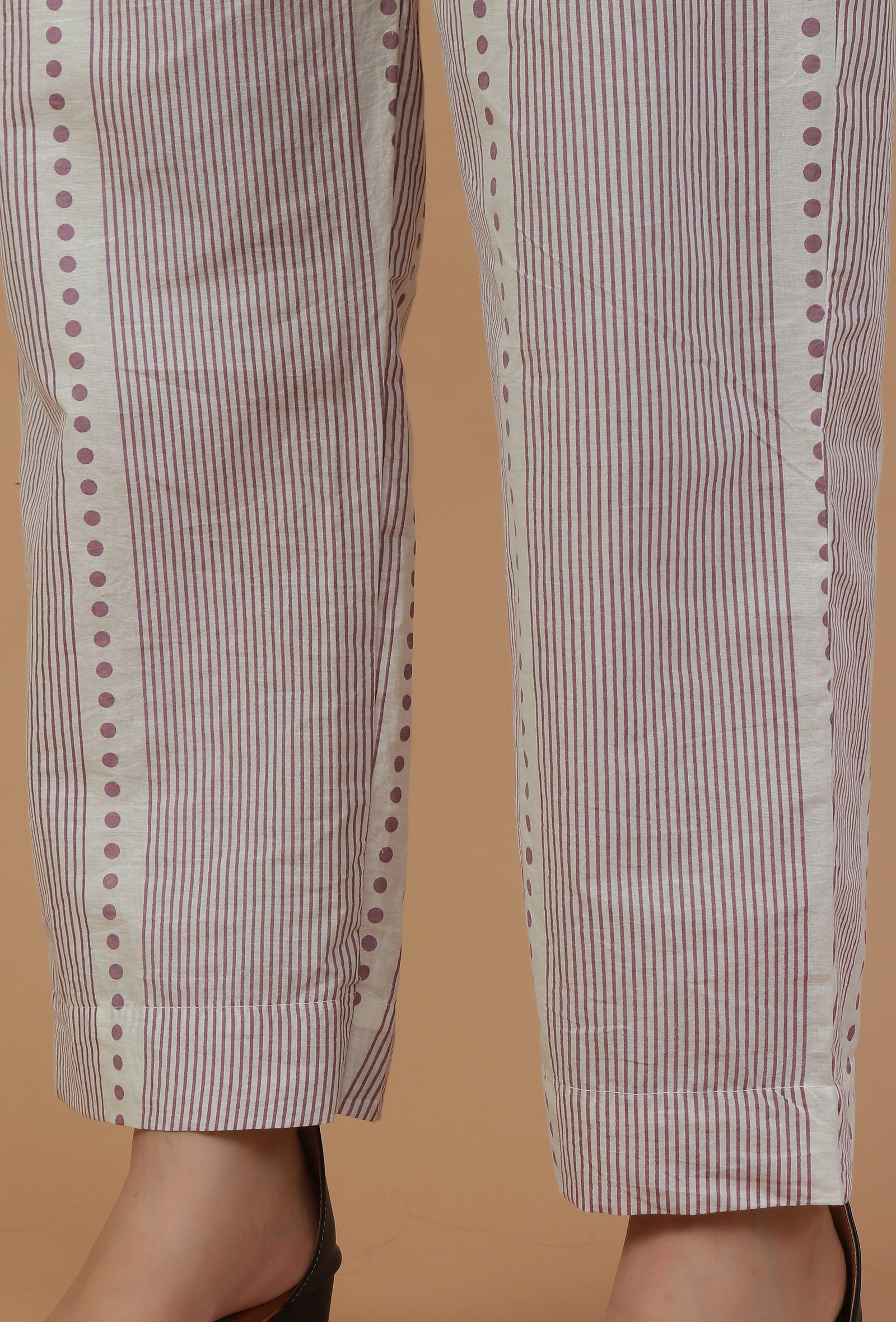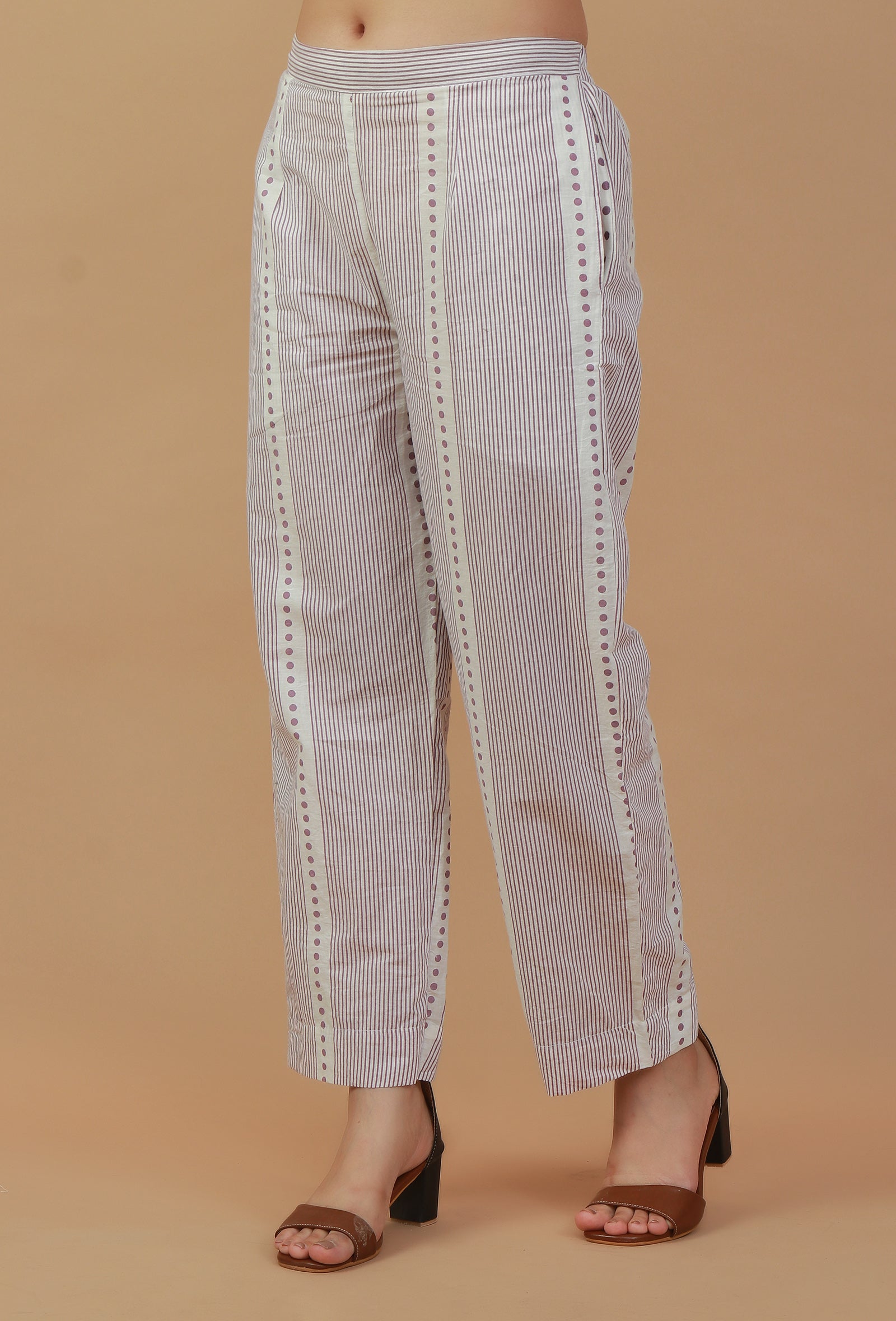 Stay stylish and comfortable with these lavender striped cotton pants. Designed in a straight fit, they feature vertical stripes with dotted printed detailing for a chic ethnic touch. Crafted from breathable cotton, these pants are perfect to pair with kurtas, tunics, or tops for a versatile casual or office wear look.