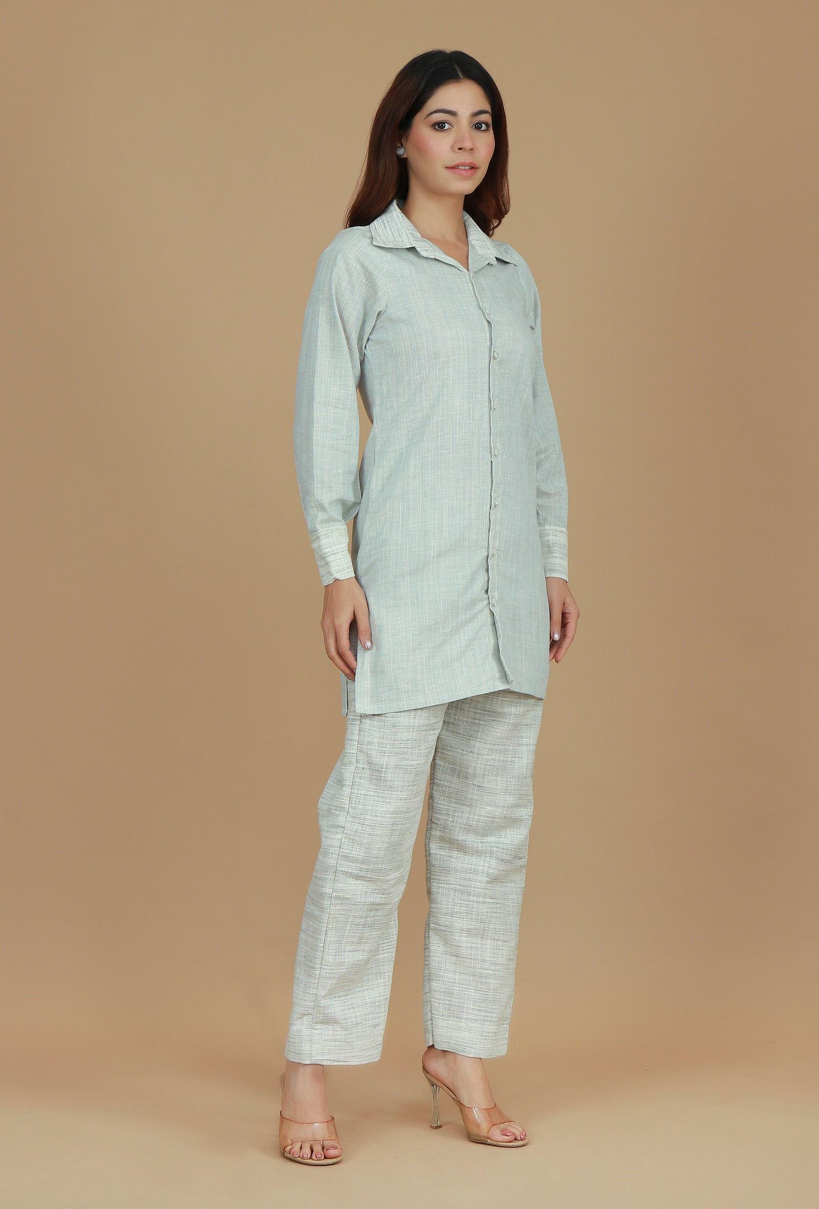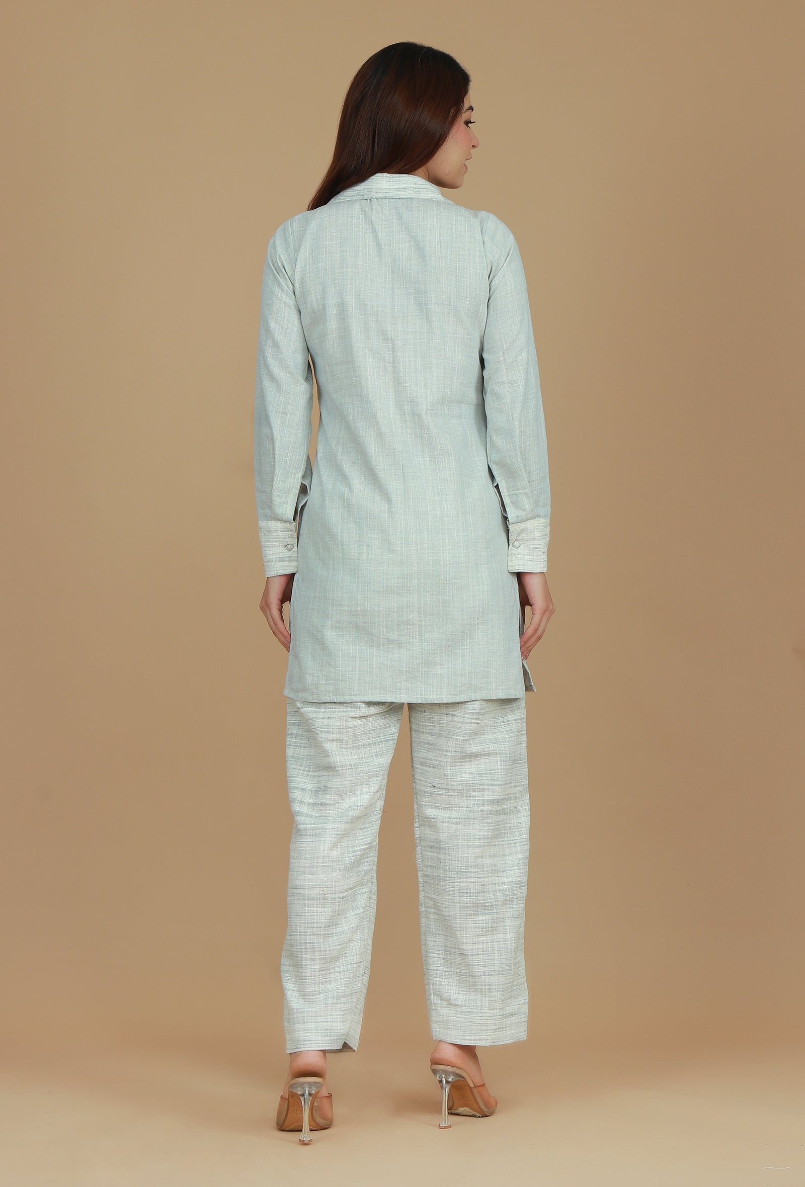 This light grey cotton khadi kurta features a classic collar and a button-down front for a simple, stylish look. The long sleeves and relaxed fit ensure comfort and sophistication, making it ideal for casual or semi-formal occasions.