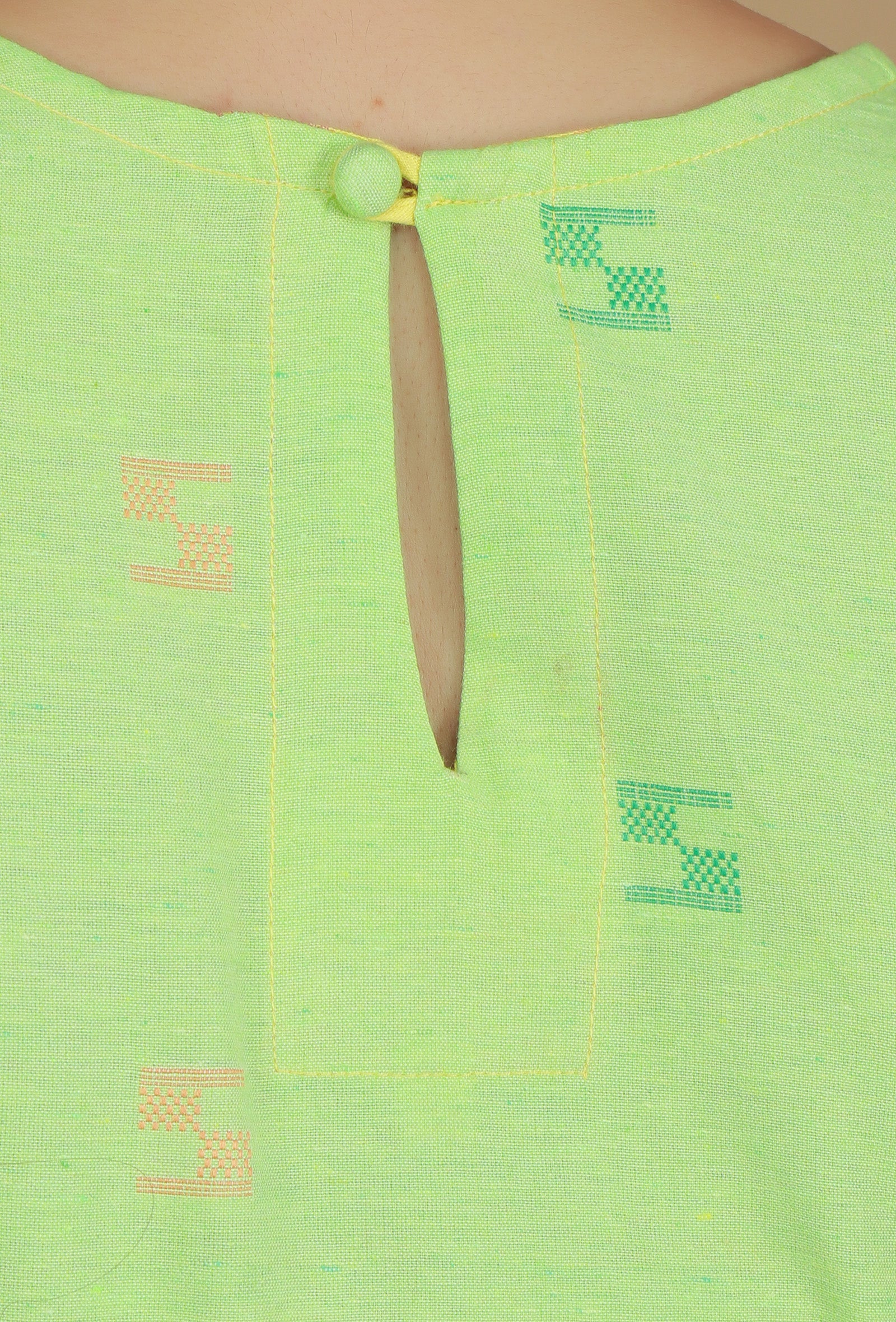 This lime green and yellow striped cotton viscose kurta combines vibrant colors with a comfortable fit. Featuring 3/4th sleeves and a round neckline with button detailing, it’s designed with side slits for added movement, making it perfect for casual wear or day outings.