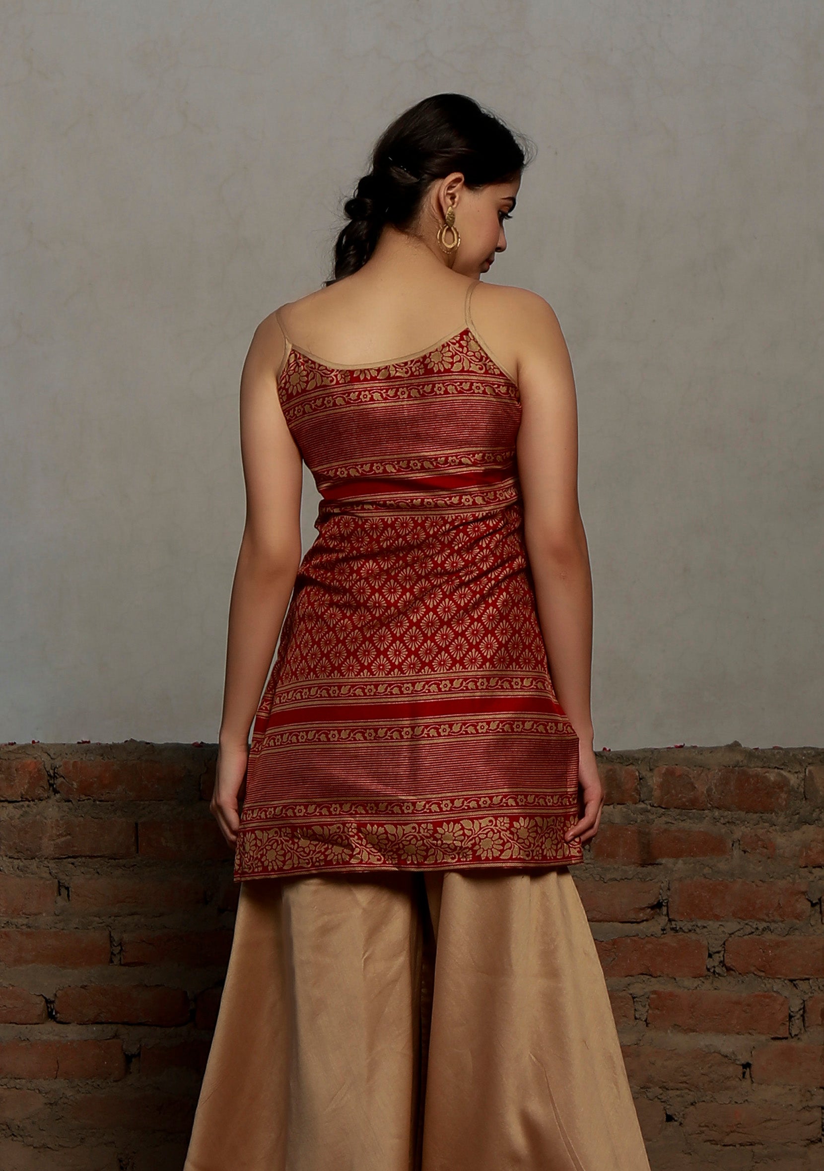 Rich in heritage and charm, this maroon Kalamkari printed top features intricate hand-block motifs on soft, breathable fabric. With its earthy tones and relaxed silhouette, it’s perfect for casual outings or cultural gatherings. Pair it with jeans, skirts, or ethnic bottoms for a stylish, rooted everyday look.