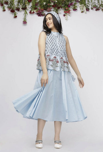 A classic spring outfit can never go wrong with this gorgeous boho style! This set includes Plum Organza Embroidered Blouse With Strappy Grey Block Printed Pleated Dress. This knee-length dress makes a statement with its stunning hand block printed design...