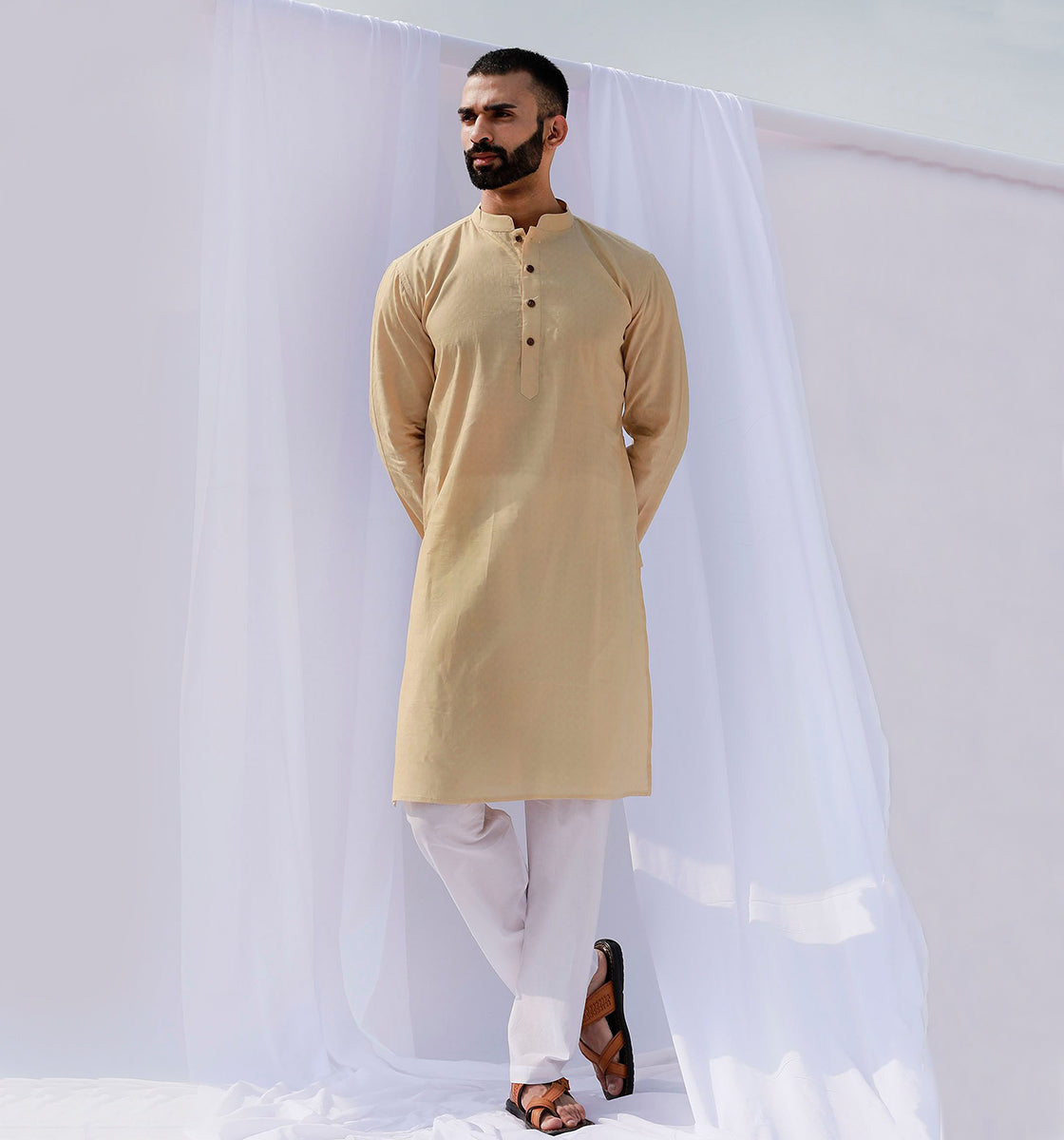 Presenting a classic and stylish long kurta from tjori. The slim-fit kurta is made from the finest cotton and is embellished with intricate Stripes. Full sleeves and a mandarin collar with detail work done on the yoke add to the...