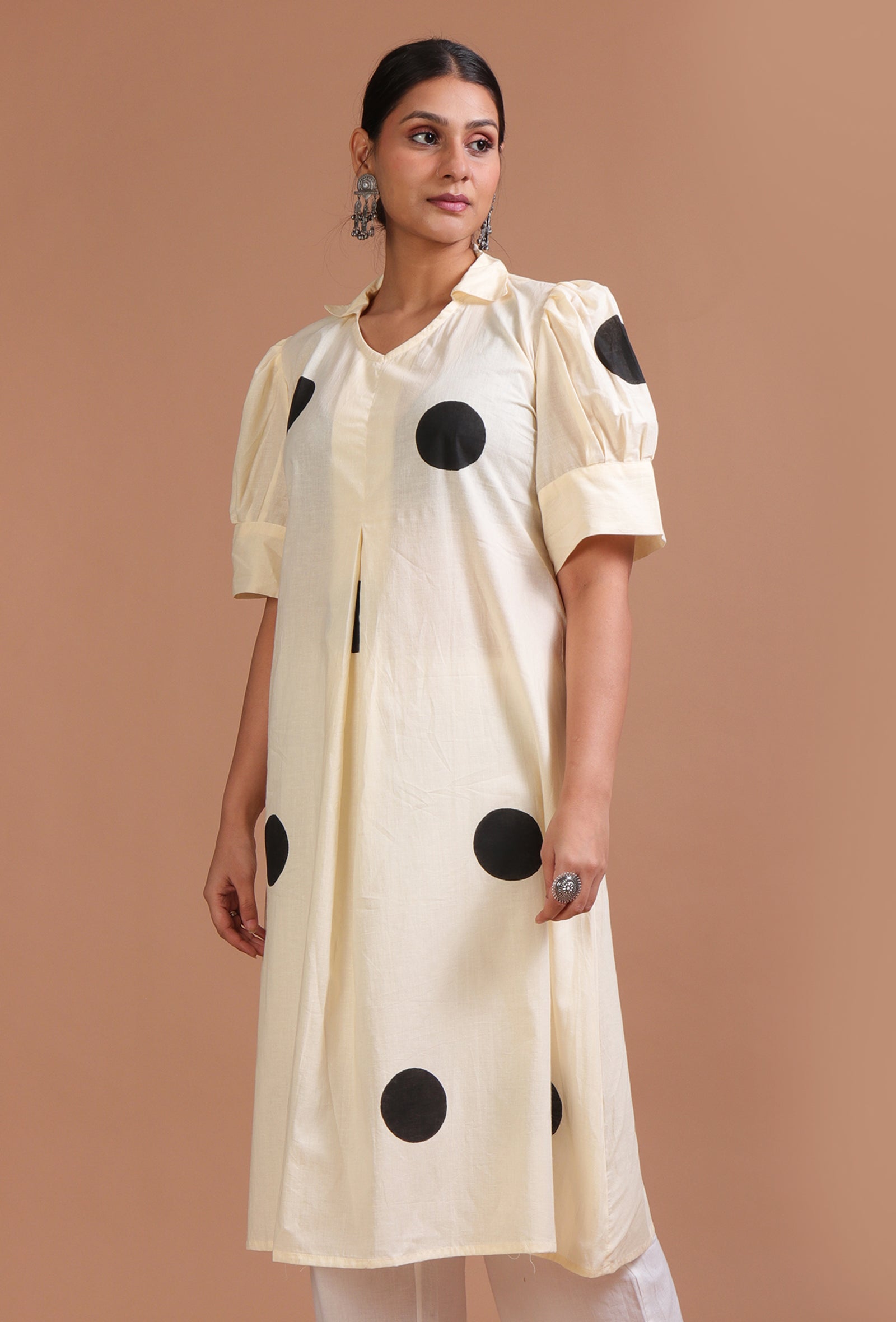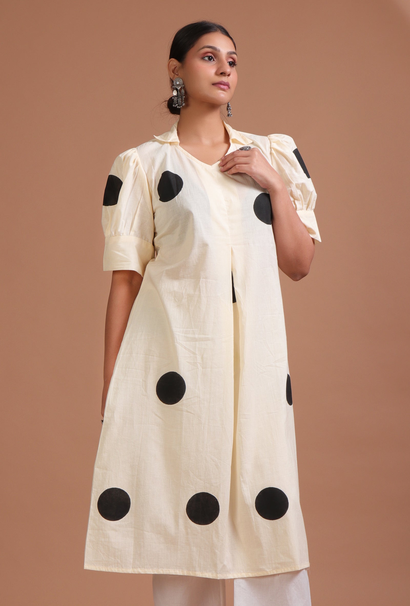 Off White & Black Cotton Printed Dress