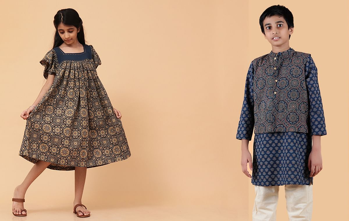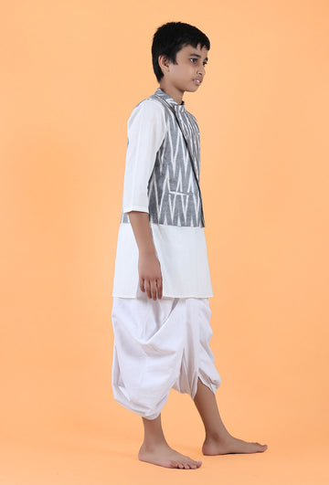 This set of kurta and dhoti pants is a cotton staple that will surely elevate your child’s ethnic style game. This set has a pink kurta featuring authentic ikat print and white dhoti pant which is elasticated at the waist...