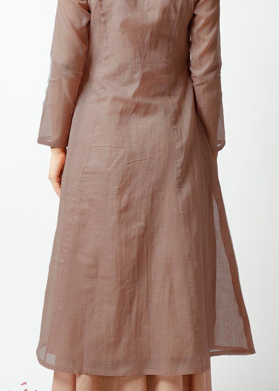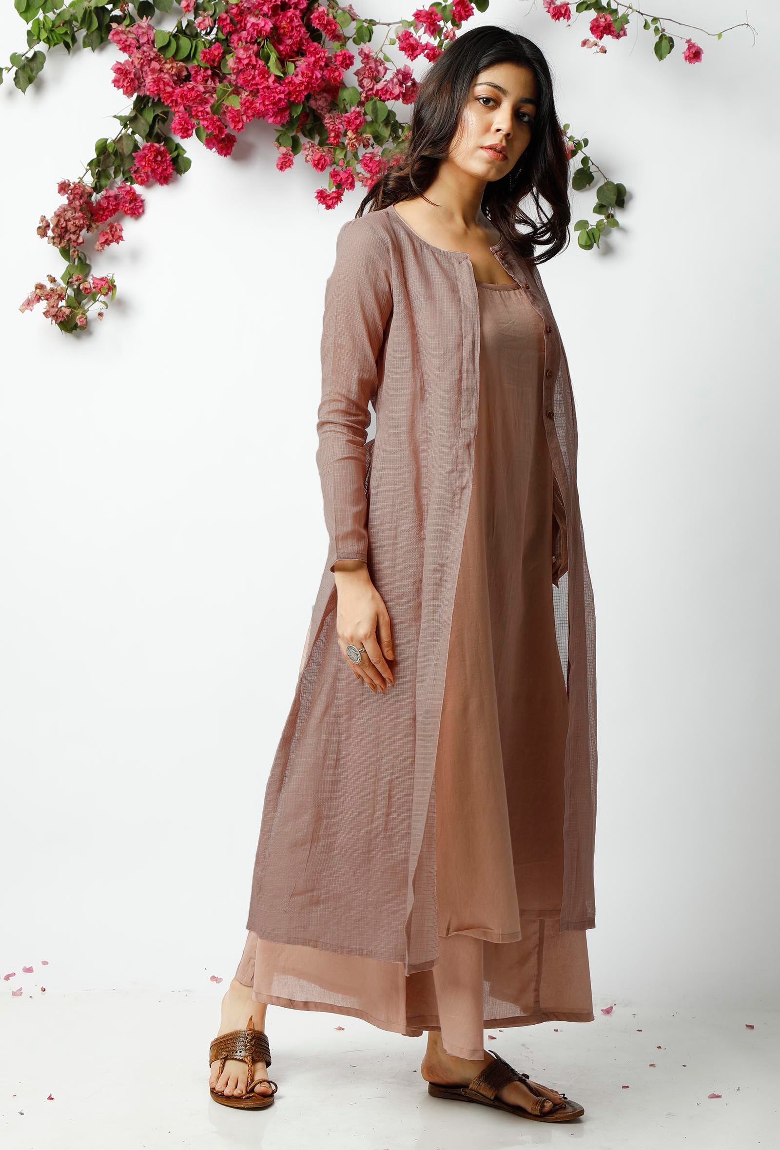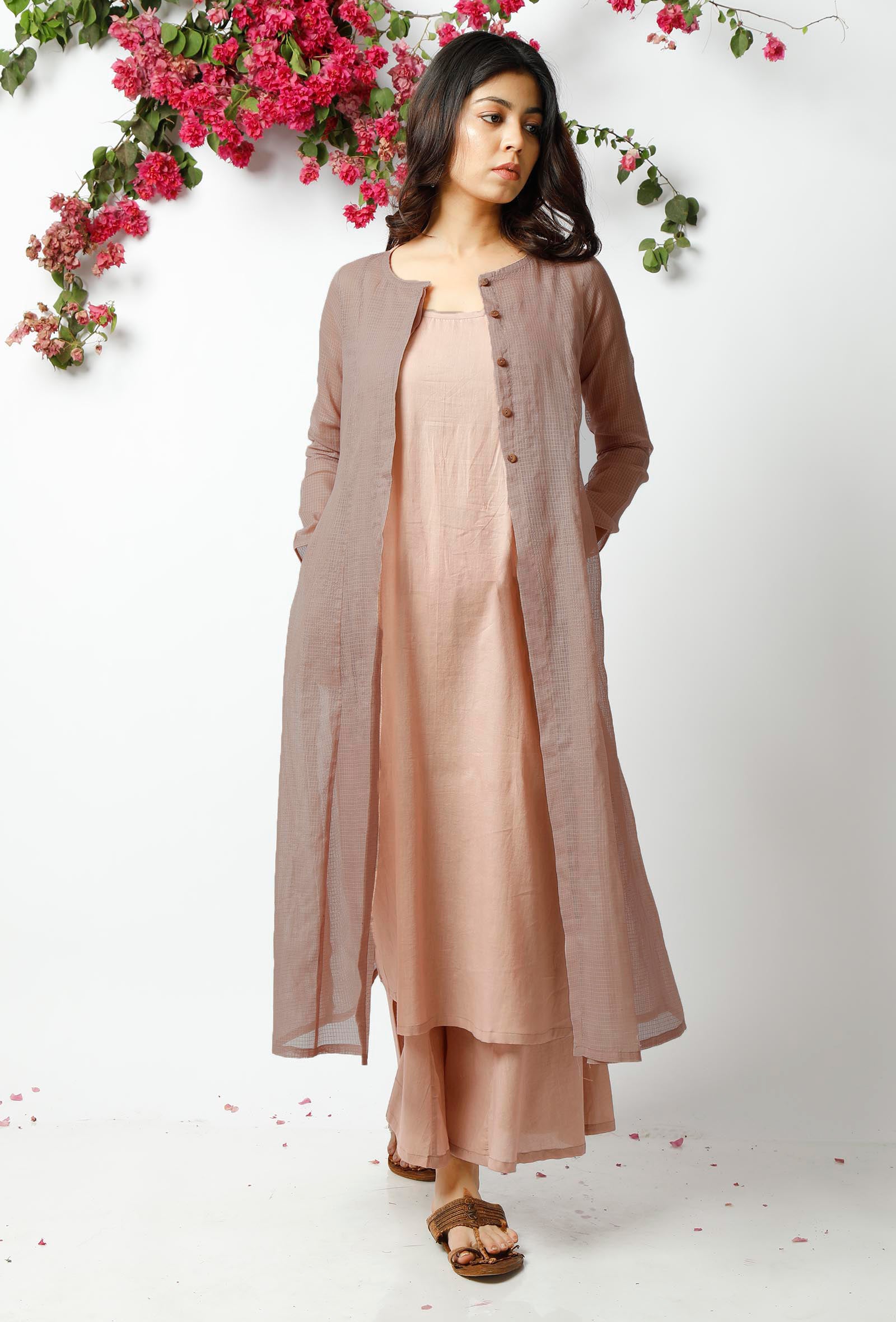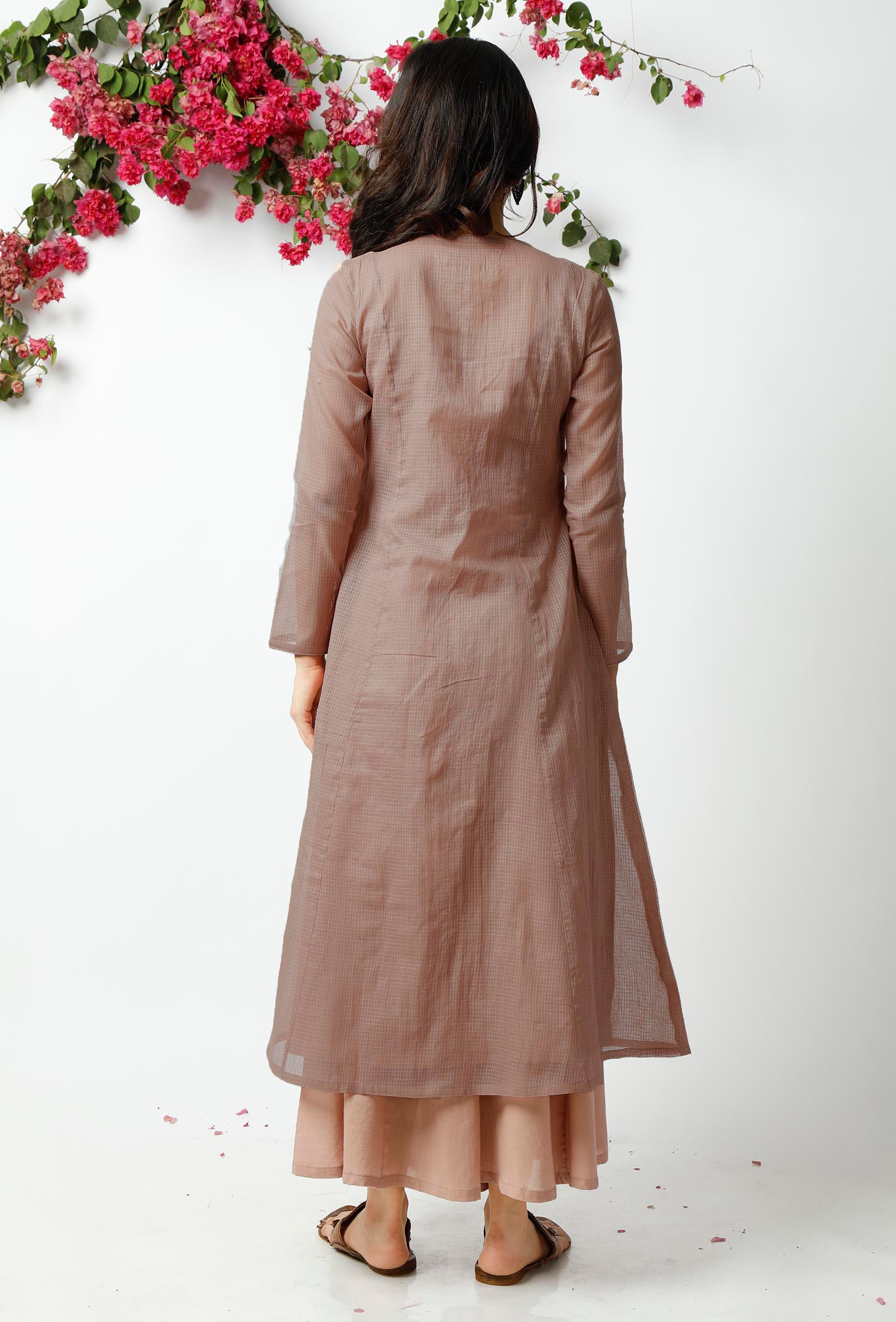 This Beige Kota Doria kali overlay with coconut shell wooden buttons is a full-sleeved front open piece that adds a formal and graceful look to your attire. This overlay has a concealed placket and pockets in front, making it ideal for summers.