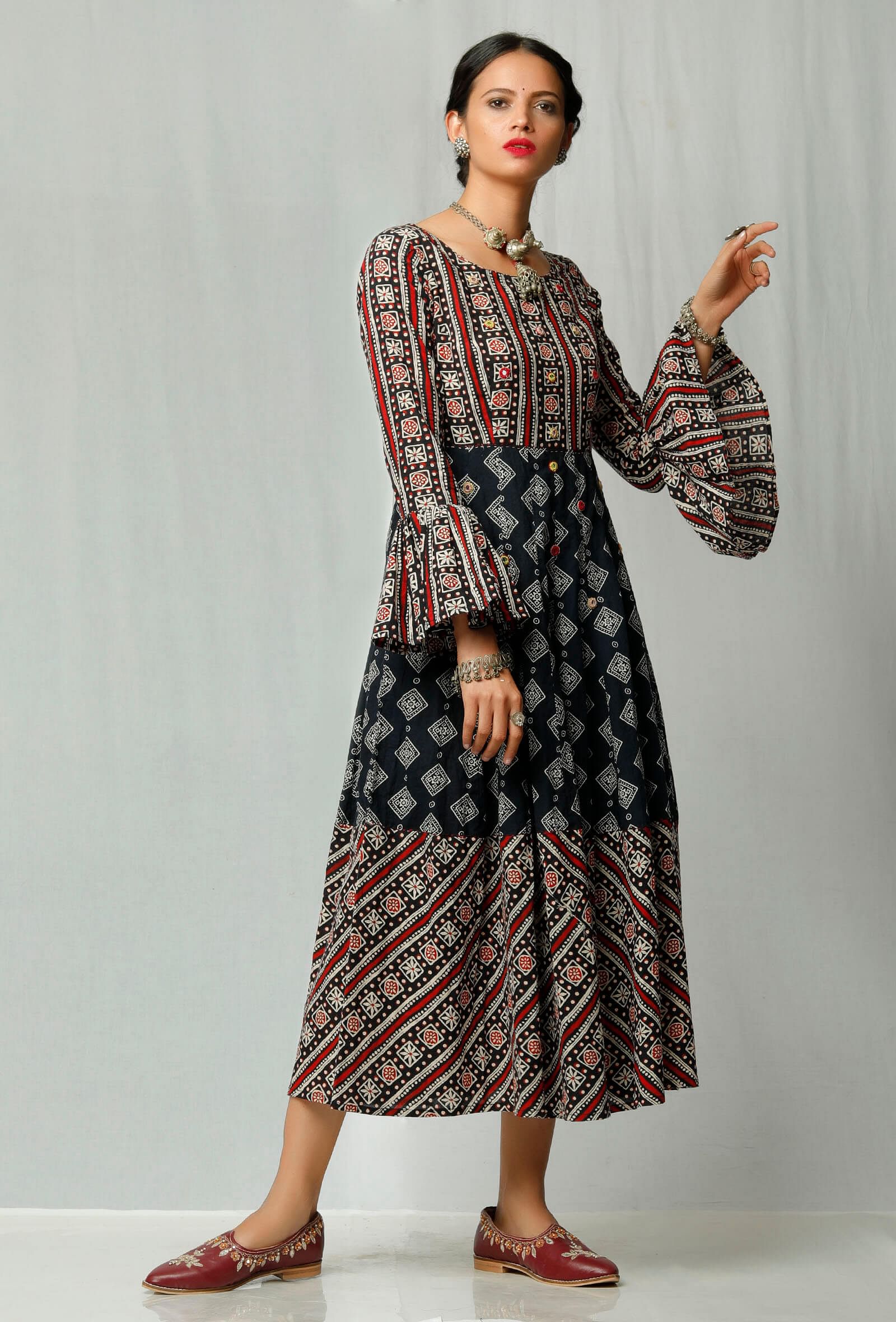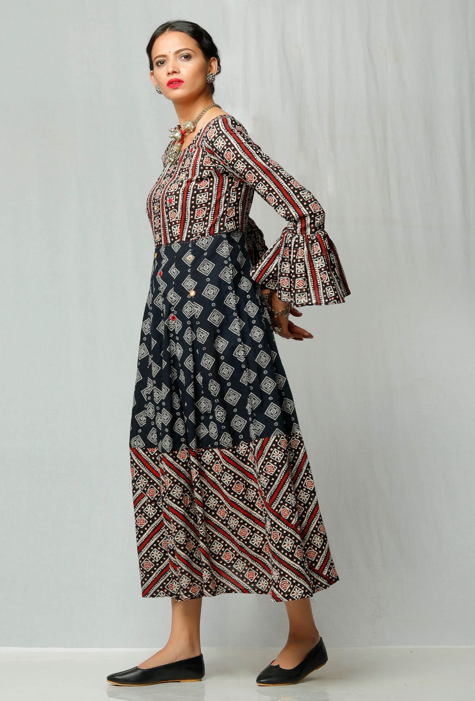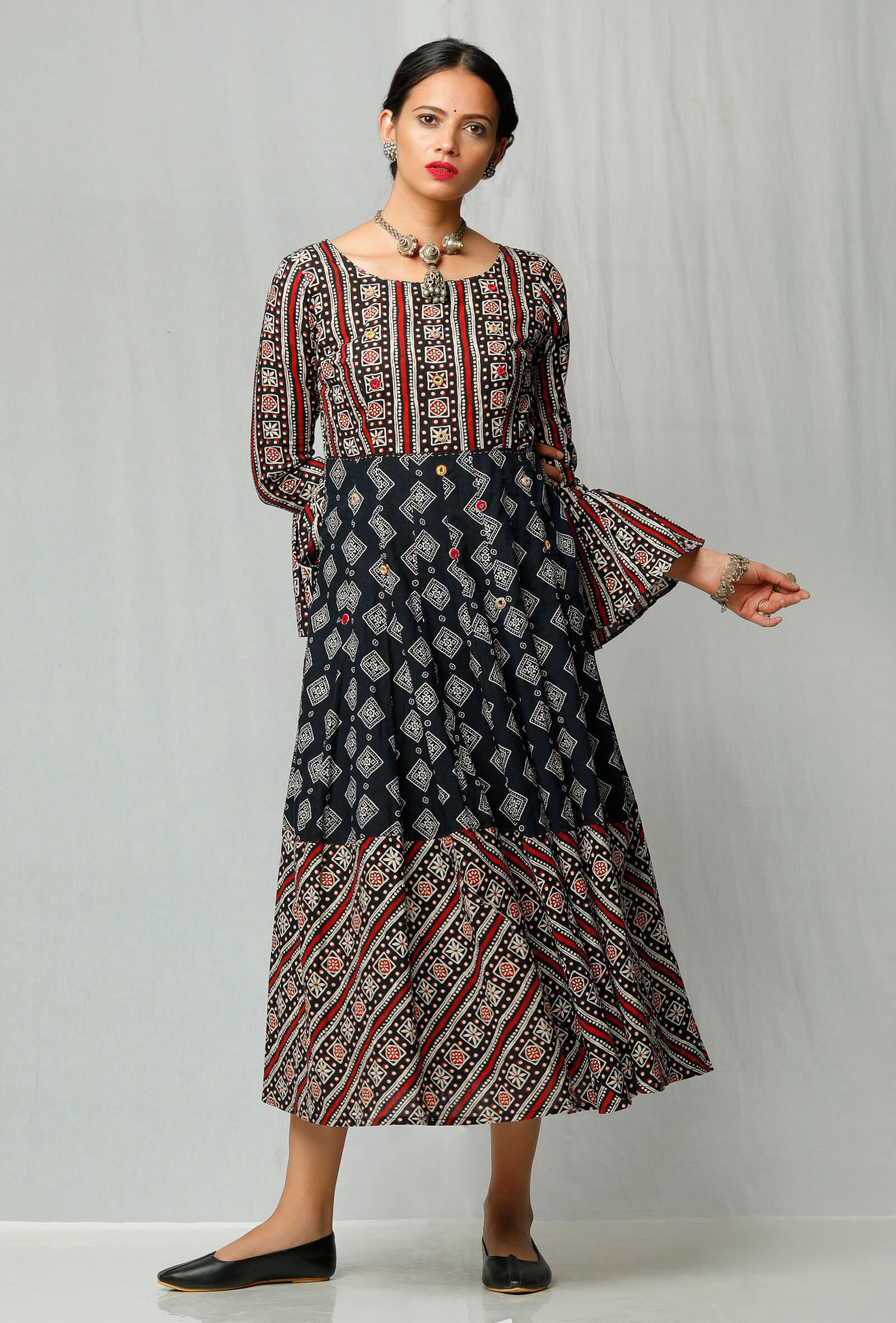 Handcrafted by skilled Indian artisans, this black cotton dress features a hand block printed pattern. This pretty cotton dress features intricate mirror and kutch embroidery. It is an ideal dress when doesn’t feel like wearing proper Indian attire, add this contemporary yet traditional outfit in your wardrobe and make a fashion statement